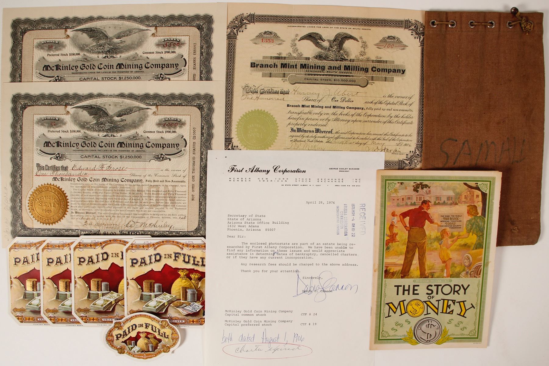 Stock certificates: Branch Mint Mining and Milling Company (Deadwood, South Dakota); McKinley Gold Coin Mining Company (two pieces); canvas bank bag from Newport National Bank of Newport Beach, California; "The Story of Money," a sixteen page cartoon booklet explaining the economics of money. Unused labels "Paid in Full" with stacks of coins and bags of money. Al Adams Collection. HWAC# 58078
