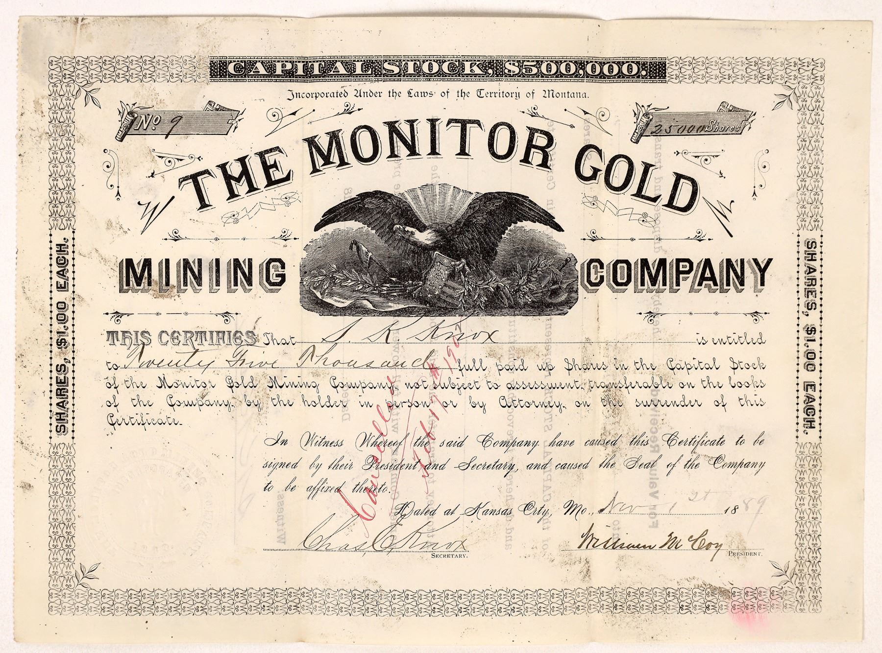Cert. #9, issued for 25,000 shares to S.K. Knox. Signed by Chas. E. Knox as secretary and William McCoy as president. Inc. in Montana Territory in 1889.