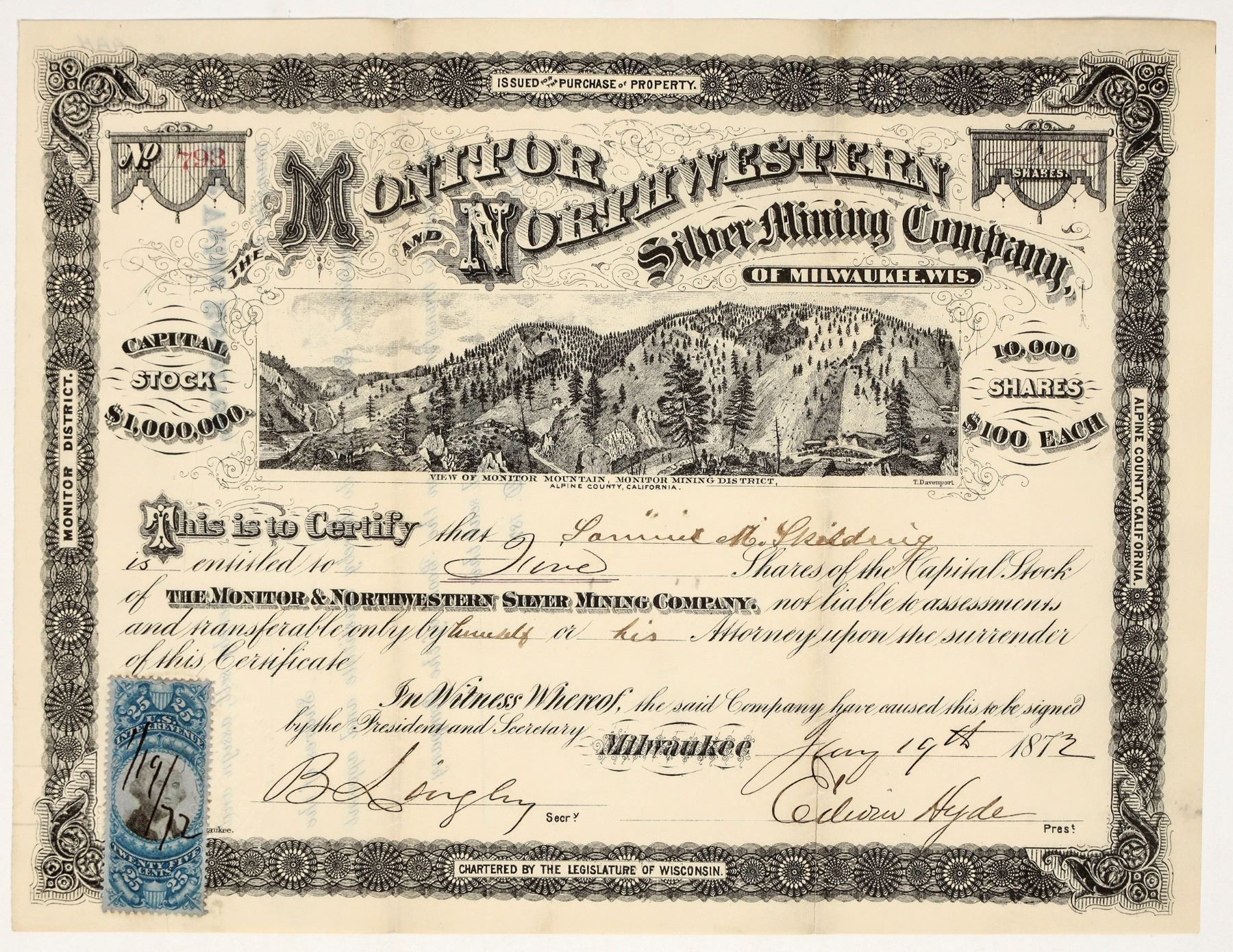 Spectacular stock certificate! Eye catching T. Davenport vignette of Monitor Mountain, Monitor Mining District, Alpine County, California. Number 793, issued for 5 shares to in 1872. Datelined Milwaukee. Signed by secretary B Lingley and president Edwin Hyde. Located at "Monitor District, Alpine County, California." Not cancelled. Printed by Seifert. 25c Revenue Stamp at left. Deep folds, clean. 7.5 x 9.75" Raymond (1874, p55) says that the company "... consists of a tunnel location starting at a point on the river and running thence nearly east to a point under the center of Monitor Mountain This tunnel is designed to open up the entire belt of ledges on the north side of Monitor Creek, between the river and the town of Monitor. It penetrates under Red Mountain to a depth of 1,300 feet and under Monitor Mountain 1,600 feet. In its course it is expected to open up as many as fifteen or twenty lodes, and among that number the Mountain lode, from which assays have been had ranging all the way from $20 to $3,000." Ore was sampled at the mint in Carson City at $18 a ton. Unfortunately when large quantities of ore were crushed at their mill they did not reach above $9 or $10.