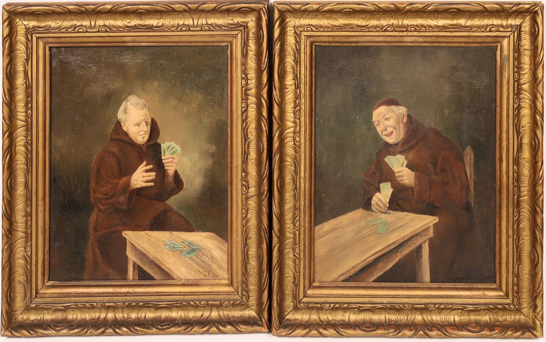 Lot of two framed oil paintings, 15 x 18 inches of monks playing cards. One monk is laughing, the other befuddled. European