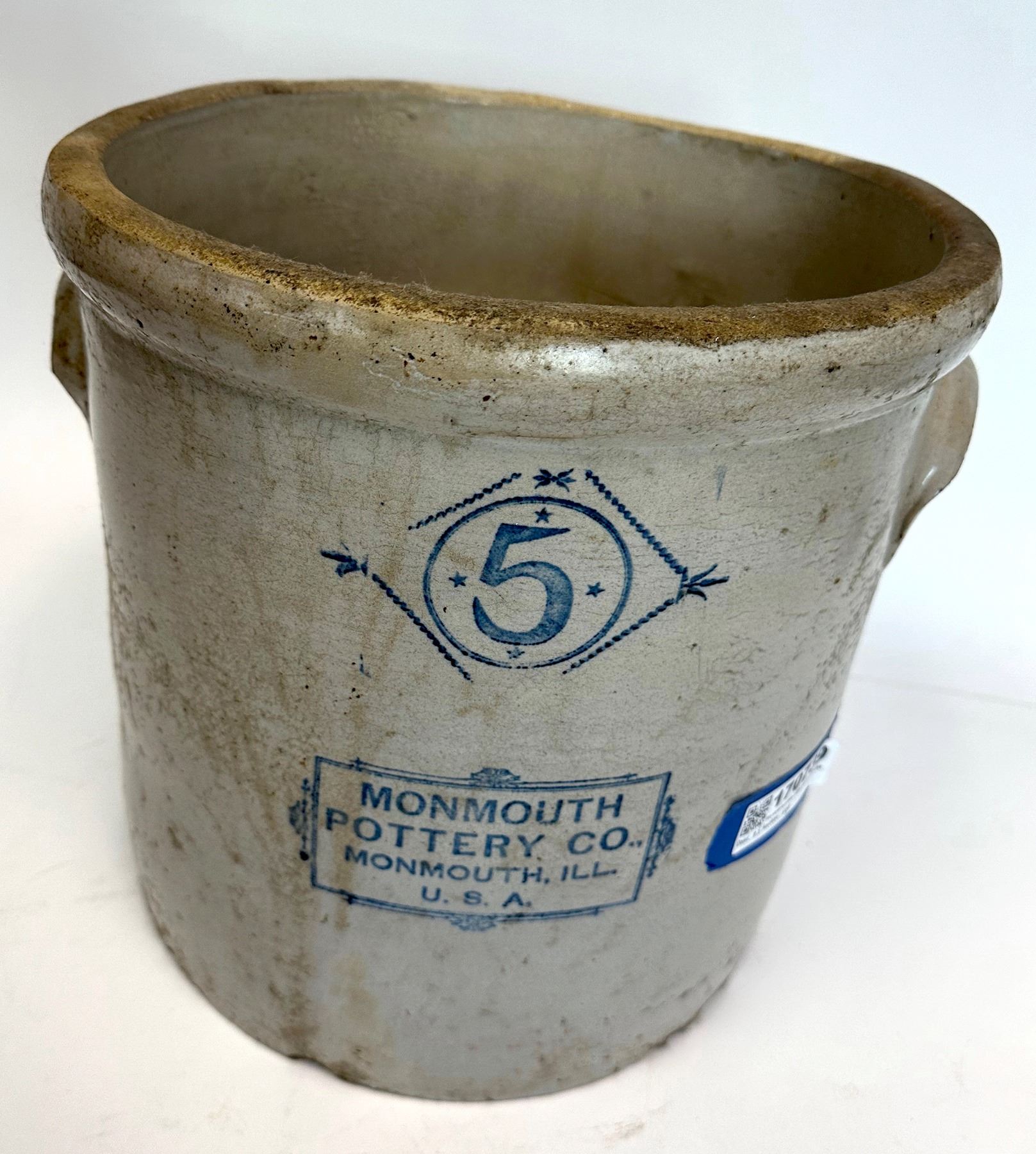 5 gallon Monmouth/Pottery Co.,/Monmouth. Ill./U S A. 13x14", several base chips. 21 lbs. Illinois Monmouth