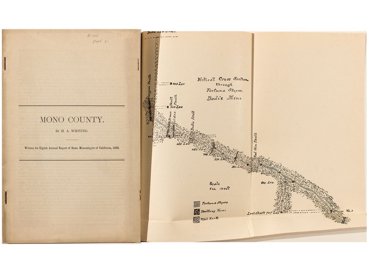 49 pages. 9" x 6." Staple binding. Mono County by H.A. Whiting. Written for the Eighth Annual Report of the State Mineralogist of California, 1888. A discussion of Bodie begins on page 31 and lasts till the end of the booklet. Includes a 9" x 10" foldout vertical cross-section through Fortuna Stopes, Bodie Mine, as well as two illustrations showing the location of faults. Discussion of the geologic and mining history of the area, as well as a table reporting bullion shipments from the various mines 1877-1888. Fantastic history reference. Minor toning and a few small rips. (Prag Collection)