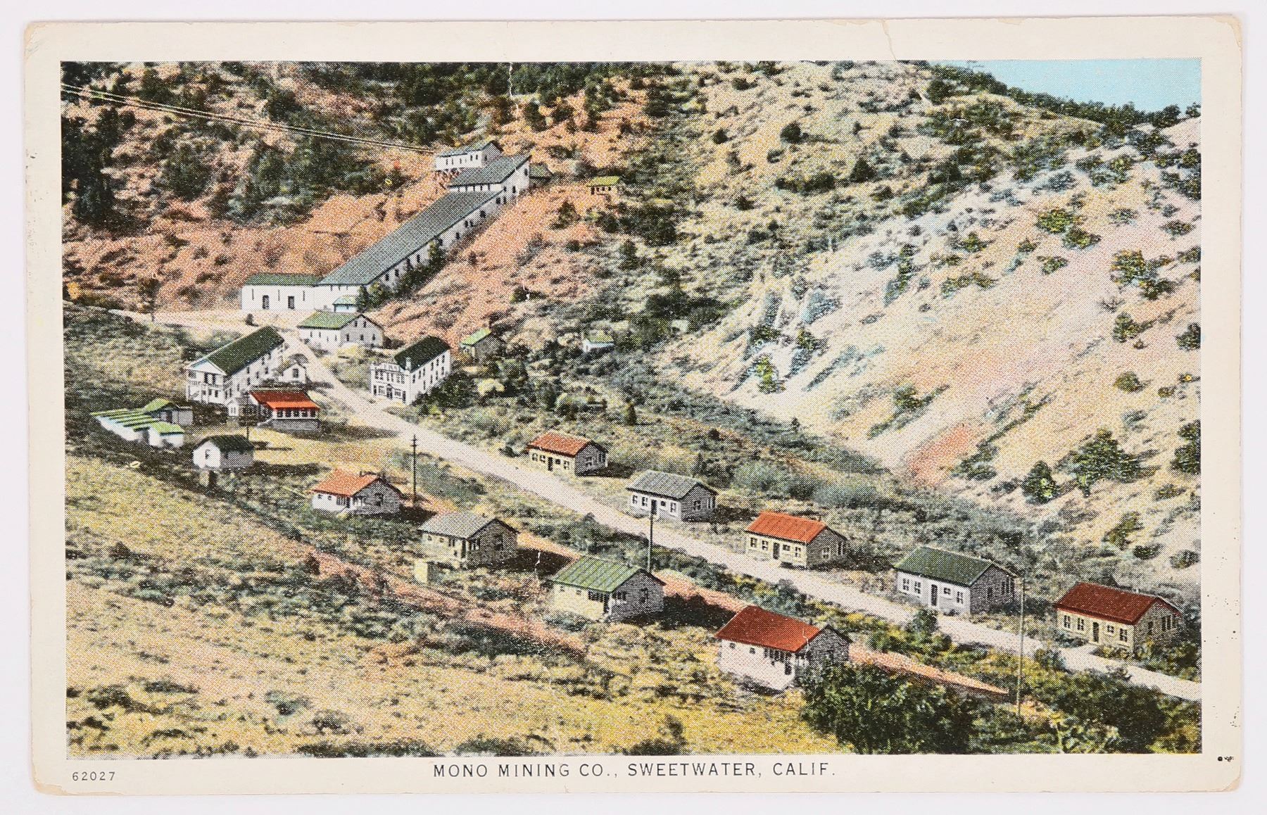 Very rare early printed color postcard showing the mining property of the Mono Mining Company at Sweetwater, California. Typed message on the reverse mentions "moving pictures" taken by the president on his recent trip to the mine properties. Chicago 1926 cancel. Creases, tear. Rare Mono County, California mining location.