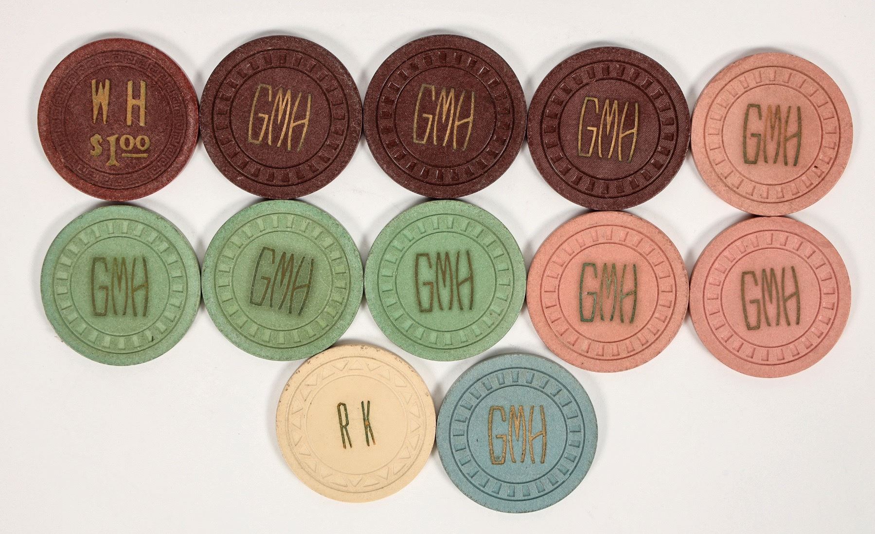 Twelve gaming chips with monogrammed initials: "RK", "WH $1.00"; and ten "GMH": three green, three brown, three pink, one blue.