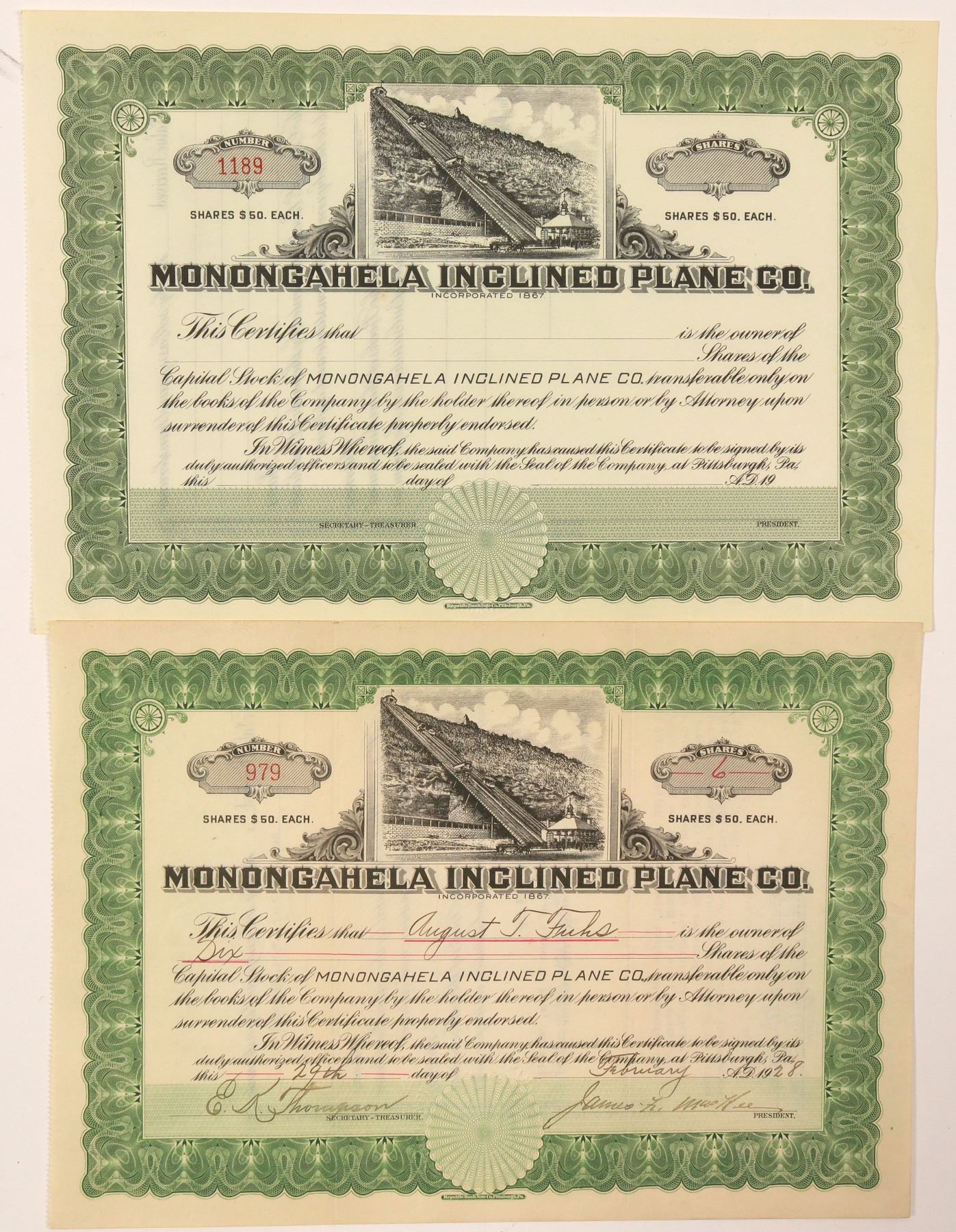 Two certificates one issued and one unissued. Both are GREEN, vignette of the inclined railway, $50 par, embossed seal w/ the incline railway center, Republic Bank Note Co printer. Excellent condition. #979 issued Feb 29, 1928 to August Fuhs, singed James F. Mashee President. Ken Prag Collection