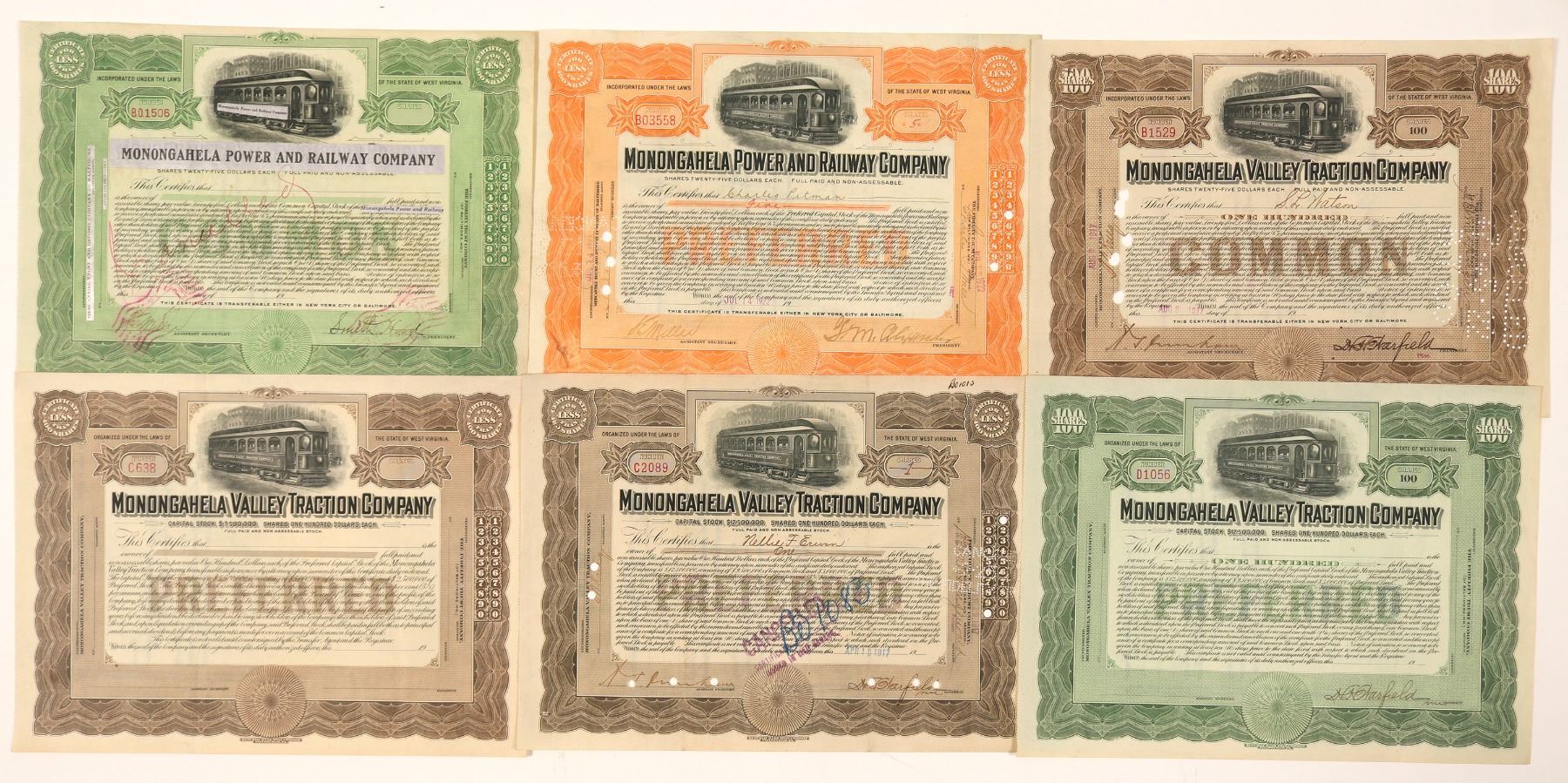 Two Monongahela Power and Railway Co. One GREEN common stock signed but not issued/canceled (19_) and one ORANGE issue/canceled ( Jul 14, 1922) preferred stock. Both embossed seals, vignette of street car l-r w/company on side of car. Both have underprint of stock type. GREEN common stock has the company name silver printed over Monongahela Valley Traction Co. Republic Bank Note Co printer for all/ Ken Prag Collection