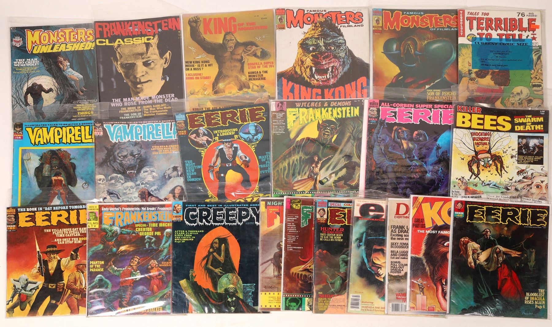 A group of 22 magazines from the world of horror and monsters. Lot include a couple of copies of Famous Monsters of Filmland and other Warren publications. There are also some Marvel Magazine publications like "Epic" and "Monsters Unleashed."