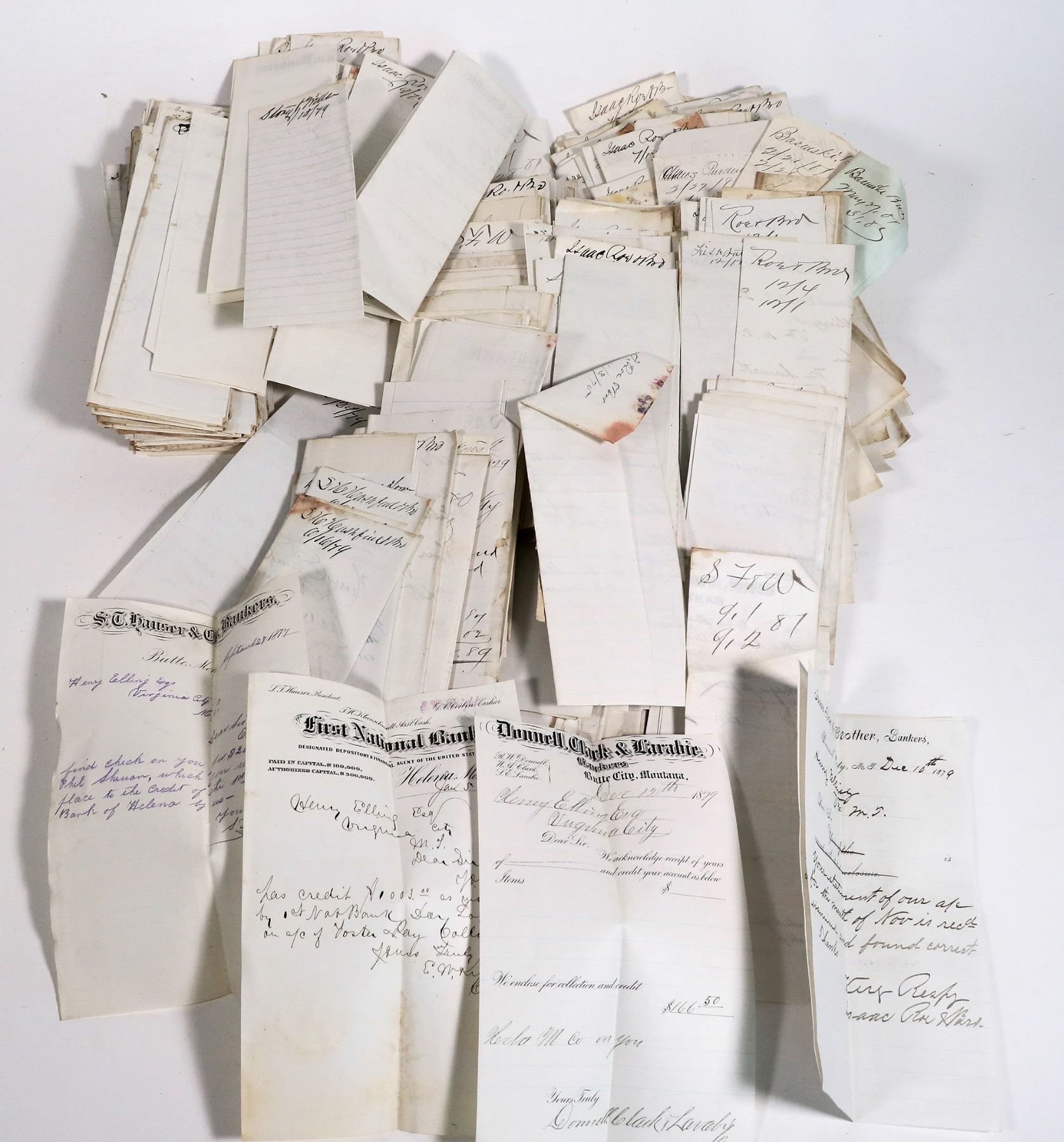 A major archive of several hundred pieces c 1875-1881 of many of the major banks in montana at the time. Most of these were heavily involved with gold mining, banking the proceeds of same and working with the mining compaies. In this archive are at least 12 different banks including one run by copper magnate W.A. Clark and another by Hershfield.