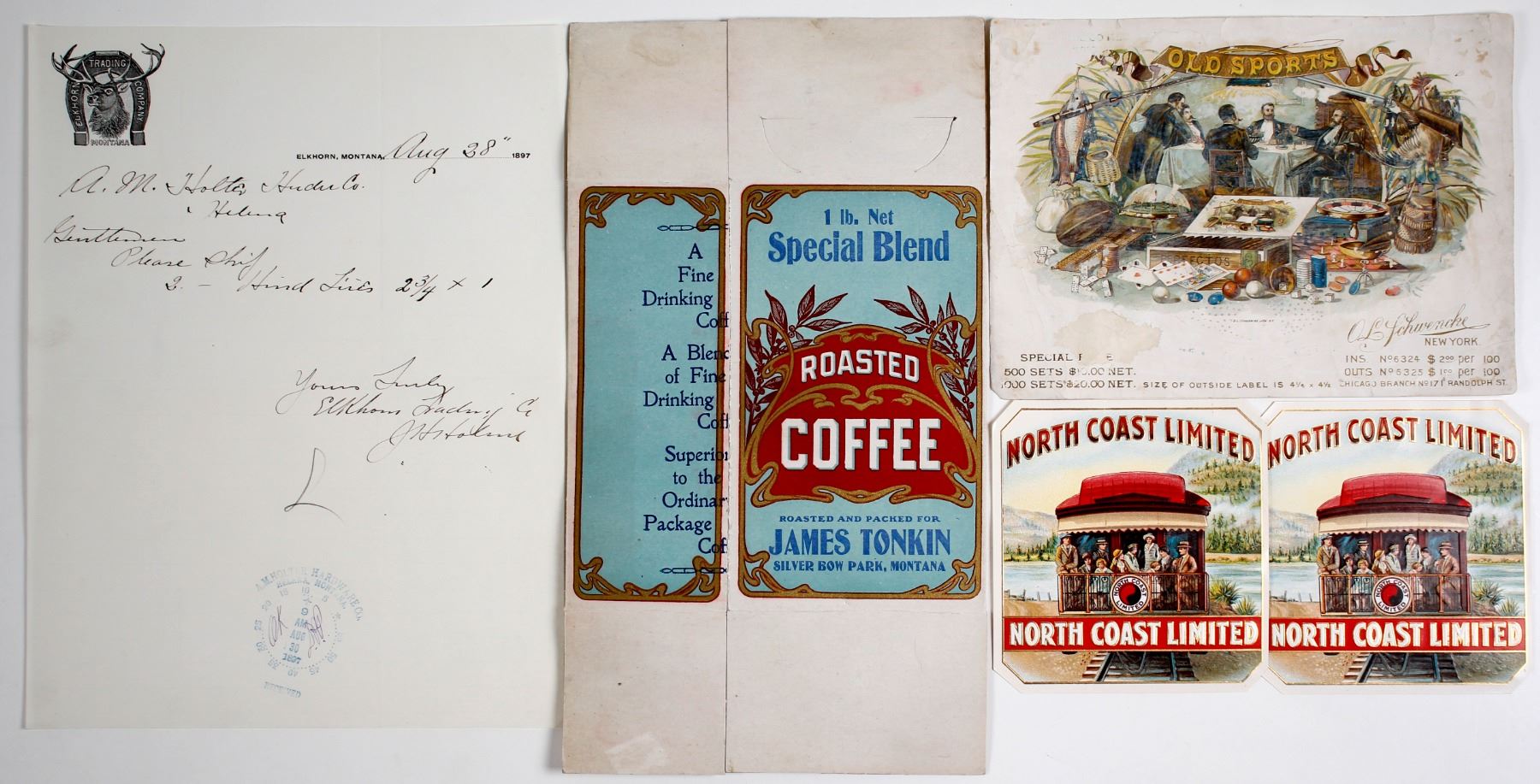 Single-page letter, dated Aug 28, 1897, from the Elkhorn Trading Company in Elkhorn, Montana, to the A.M. Holter Company in Helena, Montana. Anton M. Holter came from Norway in 1854 and worked as a carpenter in Iowa and Minnesota. In 1865, he established a sawmill near Helena, but two years later set up a general merchandise company with his brother, Martin Holter at 113 N. Main Street near the lumber yards. Anton was instrumental in founding the Virginia City Water Company as the first corporation in the Montana Territory. Other items in this lot include an unfolded cardboard carton for 1 pound of Special Blend Roasted Coffee roasted and packed for James Tonkin, Silver Bow Park, Montana, and a pair of full-color North Coast Limited cigar labels, and one full-color lithographed cigar label for Old Sports credited to O.L. Schwencke, New York. City: Elkhorn State: Montana Date: 1897