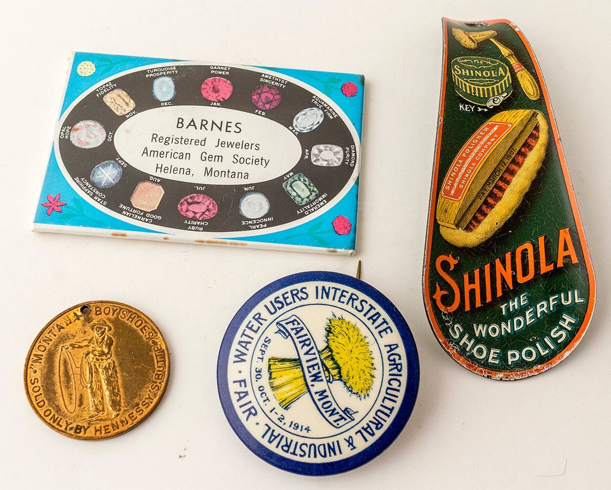 Lot of 4 charming pieces. 1) Mirror from Barnes Jewelers of Helena. 2) Shoehorn for Shinola shoe polish. 3) Button for the Water Users Interstate Agricultural & Industrial Fair. September 30-October 2, 1914 located in Fairview. 4) Coin for Montana Boy Shoes, sold only by Hennessy's of Butte. Date: c1915 Location: Montana HWAC # 45301