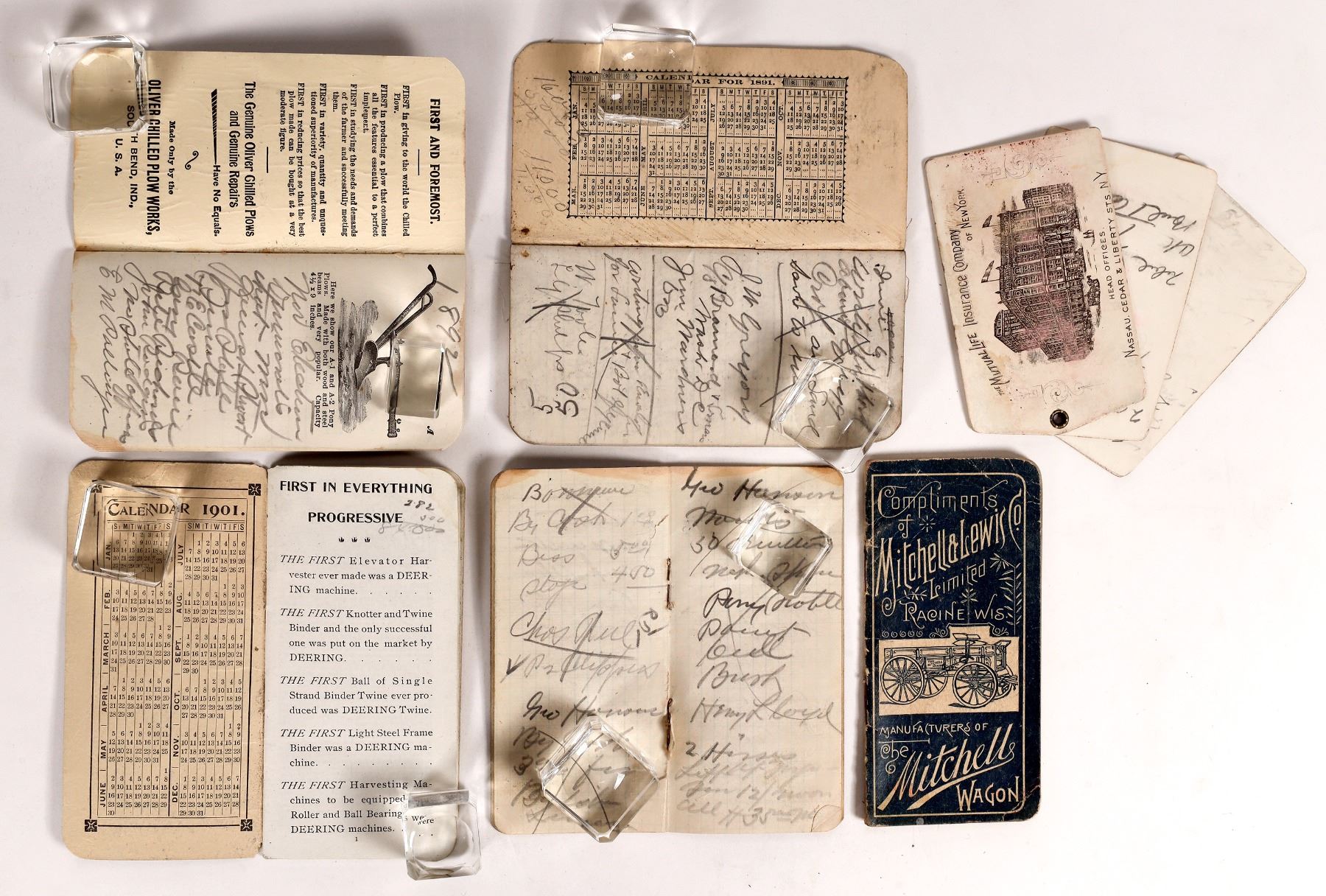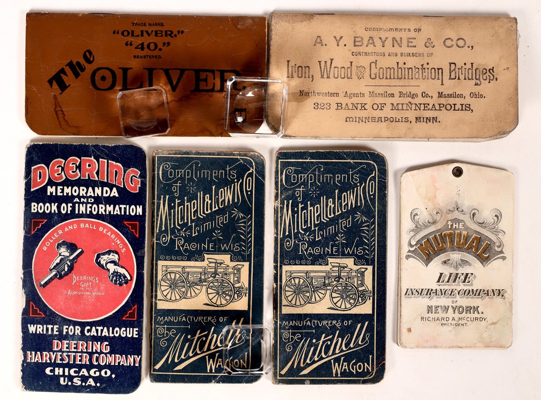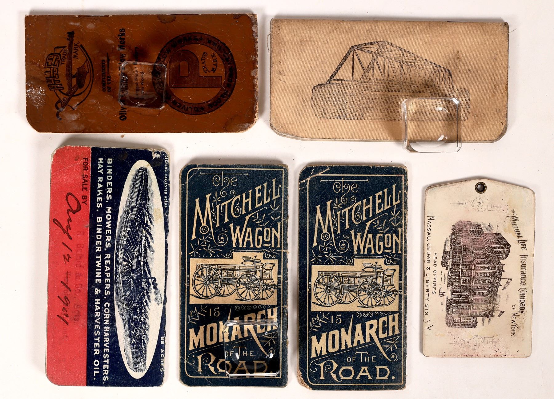 6 c. 1890-1910 Montana advertising pocket books. Mitchell Wagon, Oliver Plows, Mutual Life Insurance, A Y Bayne Contractors, Deering Harvester. About 5x2.5".