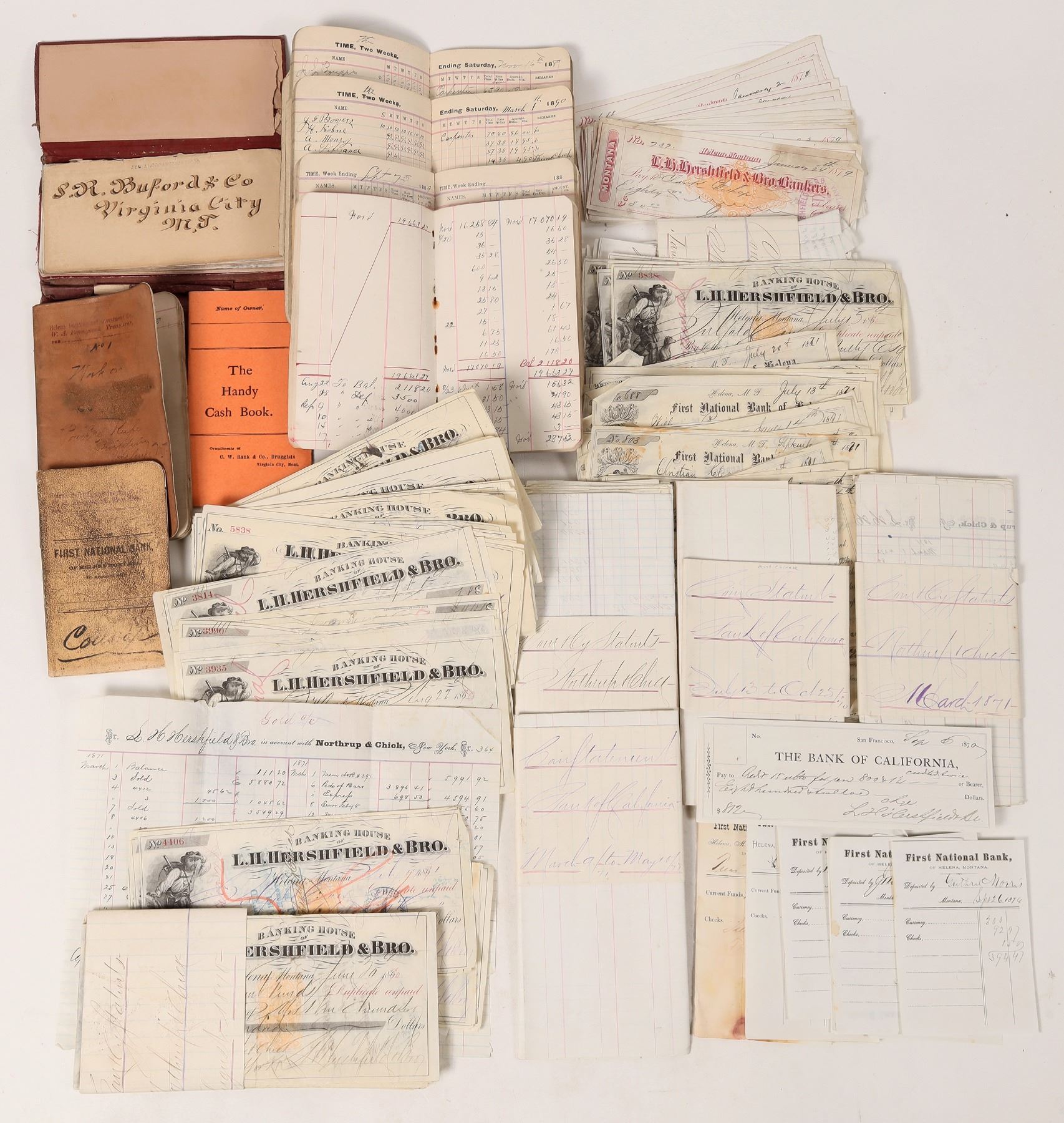 Lot of approx. 250 pieces. This is an important Montana archive covering the 1870s and 1880s. Includes ~225+ checks, CODS, deposit slips, and 8 other banking pieces (incl. bank books). 1) Bank books include: two different for Helena Building & Trust Company, First National Bank, entries beginning May 1889; and four time books for Helena Building & Investment Co., May, July, October 1889 and January 1890; an unused Handy Cash Book Compliments of CW Bank & Co. Druggists, Virginia City, Montana, 190-; and some sort of personal accounting leather book for SR Buford & Co., Virginia City, MT. 2) Massive check archive. The vast majority have imprinted revenues; most RN-B, some RN-C and some RN-G. RN Checks are Banking House of LH Hershfield & Bro. transacting with two financial institutions: Northrup & Chick of New York and the Bank of California in San Francisco. Most of the checks are the great version with a prospector and dog vignette. The checks are in very good condition; the CODs have a portion cut out of left side (possibly where a stamp used to be?). We did a quick scan through this hoard to look for important names and/or autographs, and did not see any notables. This collection is an important window into a key banking operation during the mining heydays in Montana Territory. The LH Hershfield & Bro. Banking House in Helena operated 1865-1882. It was located in Last Chance Gulch, near the corner of Bridge St. and Warren St. It then became the Merchants National Bank from 1882-1898, then Union Bank & Trust Co. 1898-1959. Hershfield also had a banking business in Virginia City, Montana. Please inspect.