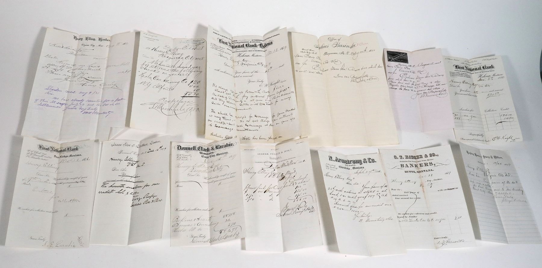 About 12 different 1870s-1881 banking documents from teh height of gold mining in Montana. These bank statements all carry full letterhead of the bankers. Included are; Donnell, Clark (W.A.) & larabie, Butte 1897; Issac Roe & Bro, Bannack, 1879; Julius Basinski & Bro, Bozeman, 1881; FNB of Helena, 1879;FNB, Helena, 1880; FNB, Deer Lodge, 1876; Hershfield, Helena, 1878; Story & Willson, Boseman, 1879; Hauser, Butte, 1879; Elling, Virginia City, 1881Armstrong, Glendale, 1880; J Basinski & Bro, Miles City, 1881; Seebree, Ferris & Holt, terminus Utah & Northern RY, 1880. Montana c. 1870s