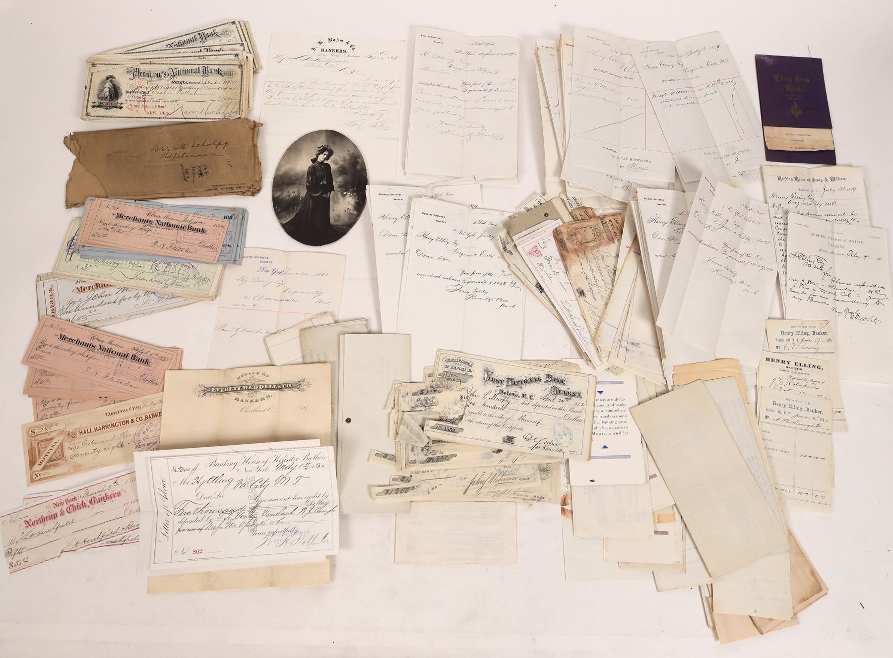 About 100 Montana banking ephemera items. c. 1870's to 1920's. 1870 letterhead signed by Sol Star, an associate of Seth Bullock and "Just after the Civil War he moved to Montana, engaging in business in Helena. Star distinguished himself in public service in Montana, serving as territorial auditor and personal secretary to the Governor." from blackhillsvistor.com. Checks, legal documents, bank promo items, asset reports, letterheads, Henry Elling related, billheads etc. 7x5" oval photo of a female, inscribed Elling on verso.