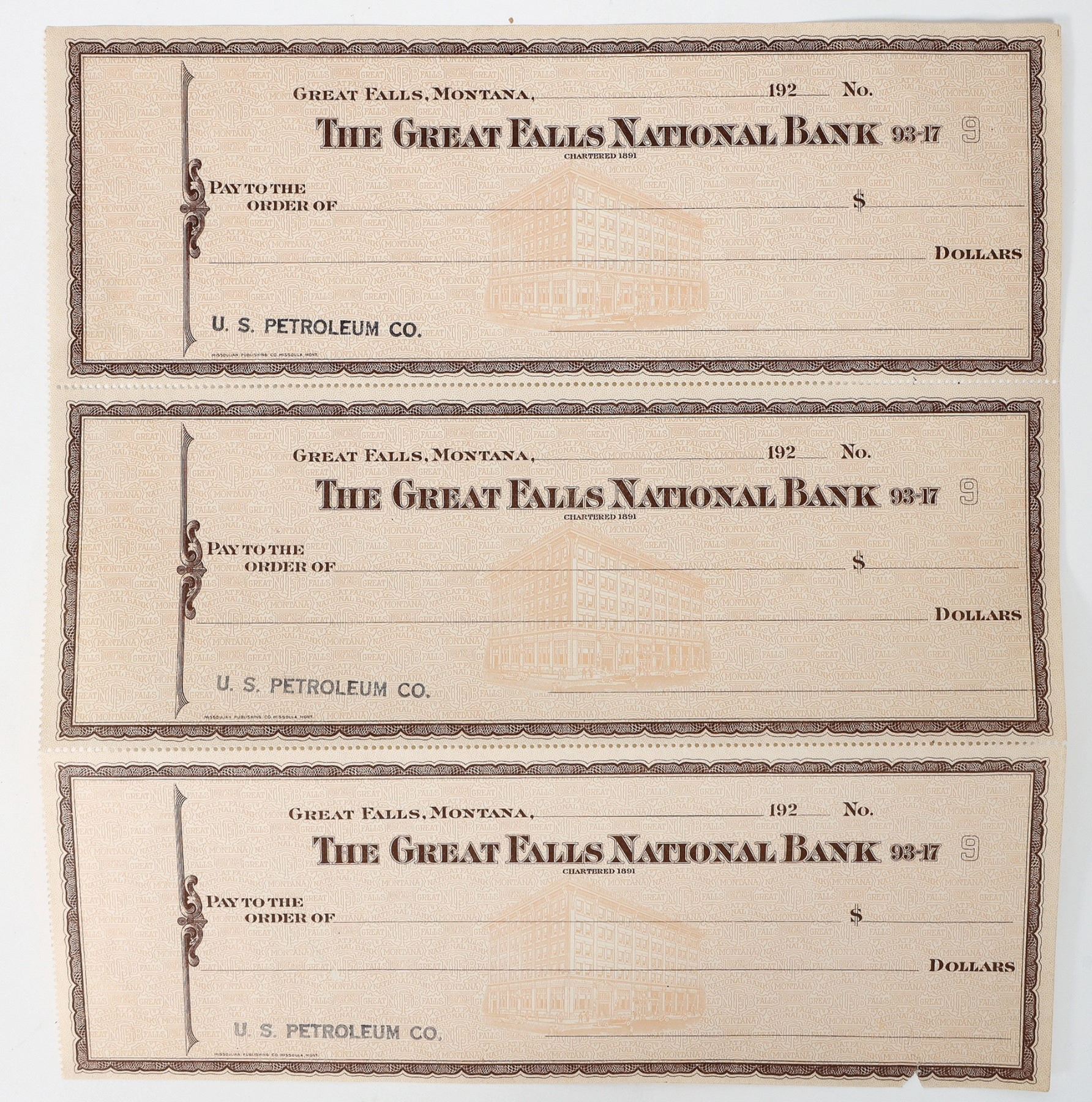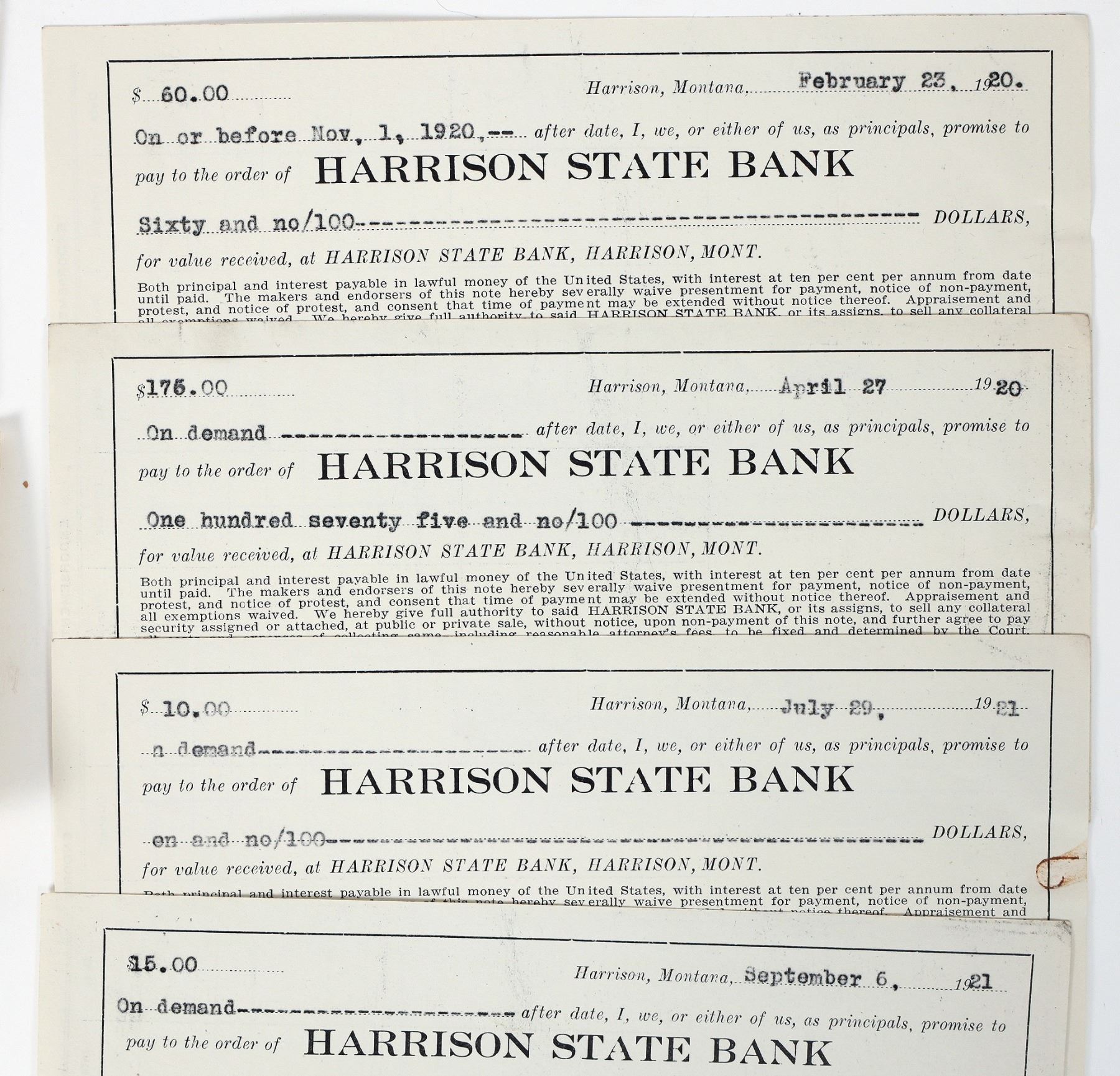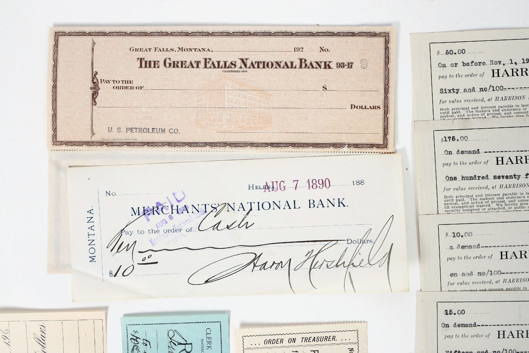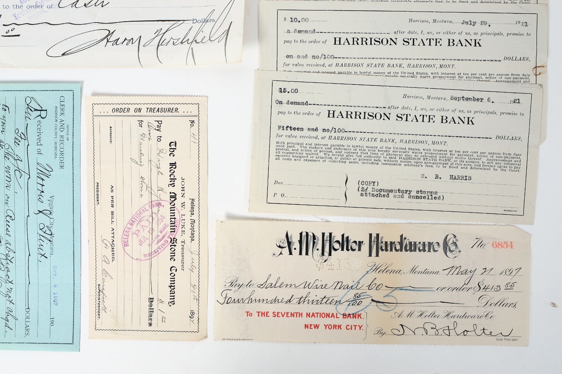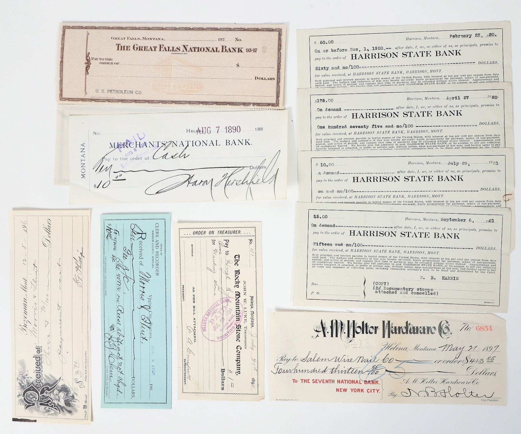 A dozen checks, receipts & notes drafted on Montana banks, c1890-1921. Includes Merchants' National Bank, bank check, c1890; The Rocky Mountain Stone Company, check, c1894; A.M. Holter Hardware Co., check, c1897; Harrison State Bank, promissory notes (3), c1920; Madison County, MT, Clerk & Recorder's Office, receipt, 1907; etc.[ Montana