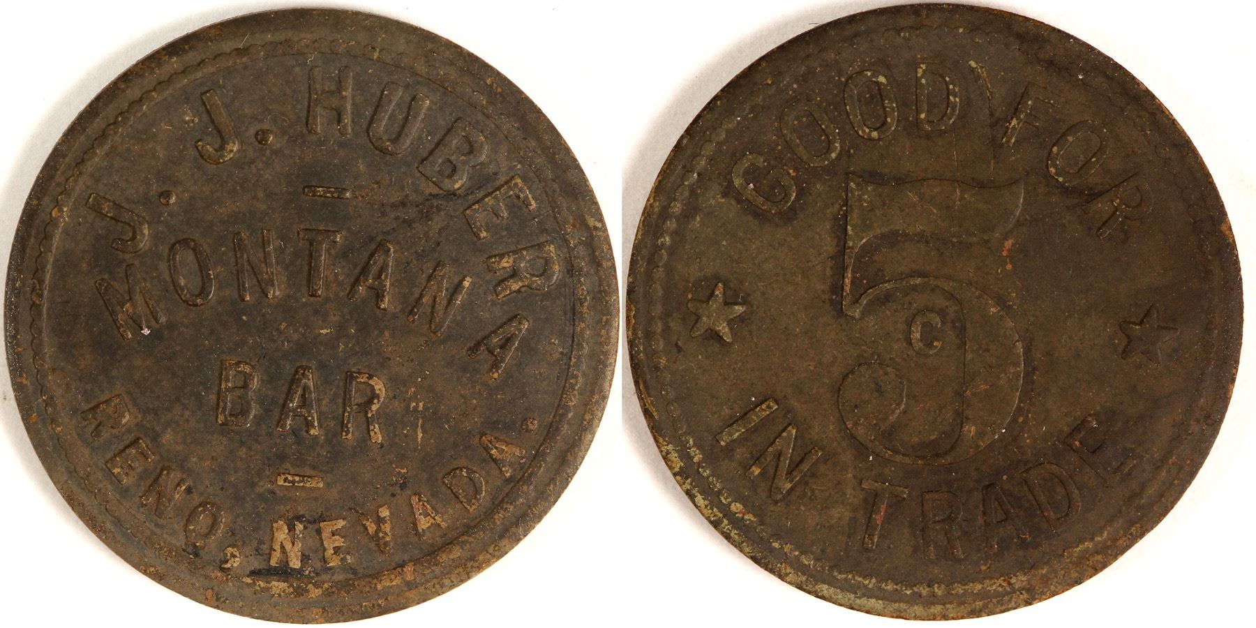 Obv.: J.J. Huber / Montana / Bar / Reno, Nevada; Rev.: Good For / 5c / In Trade. Br., rd., 24 mm. Date: Location: Reno, Nevada HWAC# 63643