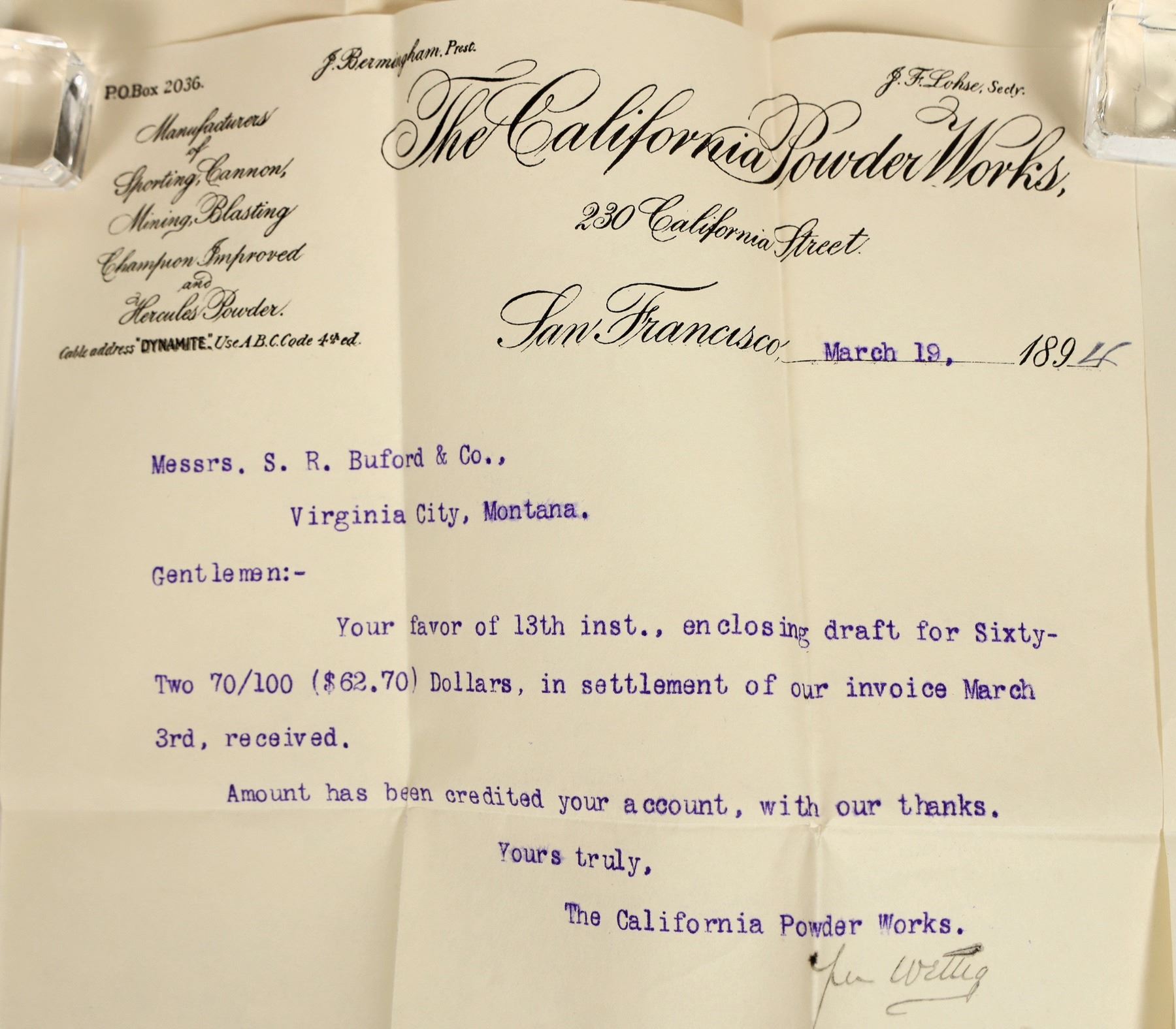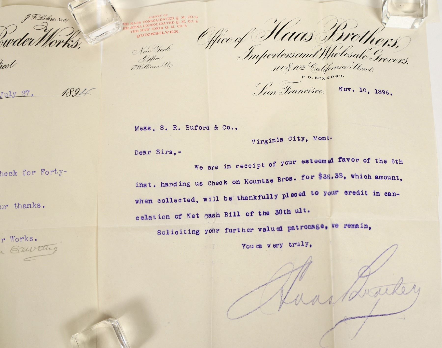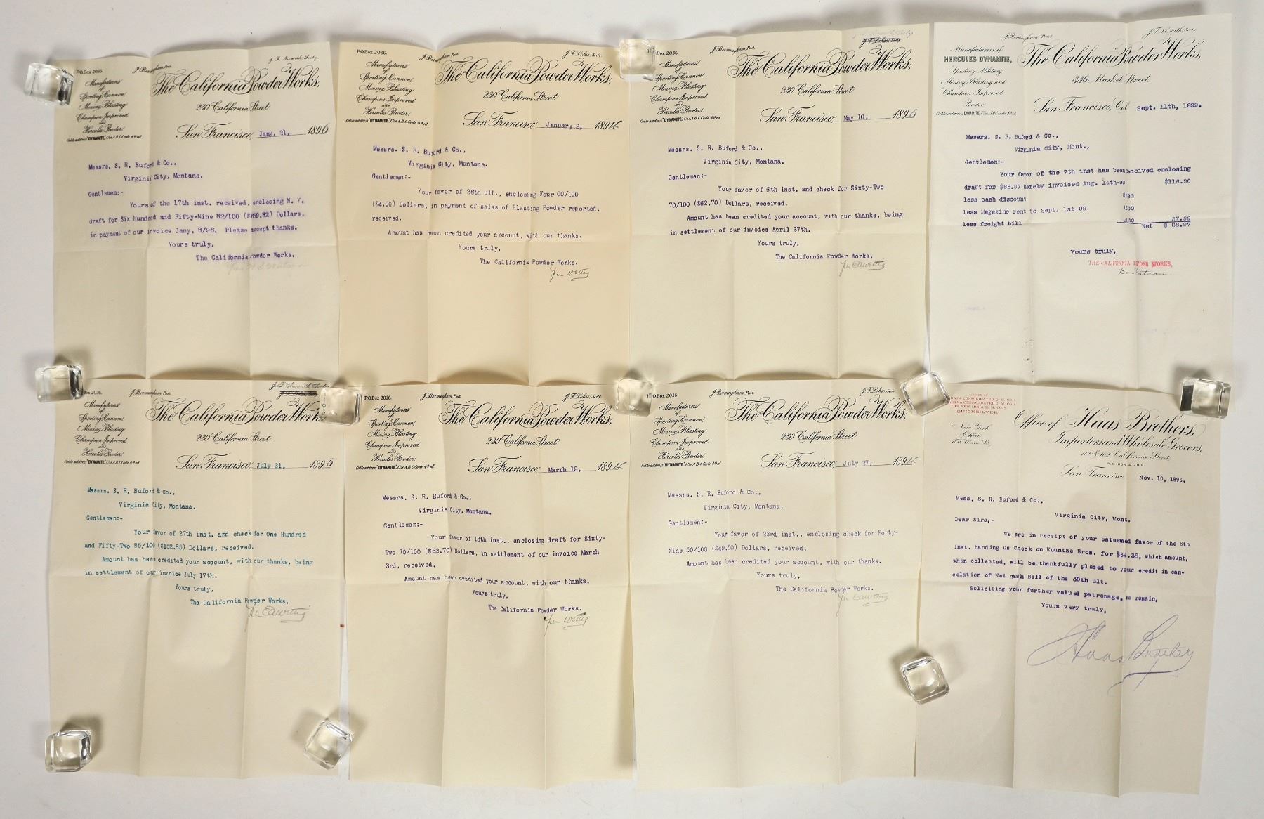 A group of 8 pieces of correspondence from the California Powder Works of San Francisco to S.R. Buford and Co. of Virginia City, Montana, dating 1894-1899. The letters discuss transactions relating to the sale of blasting powder. Also includes one letter from Haas Brothers Importers and Grocers. S.R. Buford and Co., founded by its namesake Simeon R. Buford, was initially a grocer which later expanded to become Virginia City's largest general store. All letters are typewritten on paper with cursive letterhead; all are in good condition.