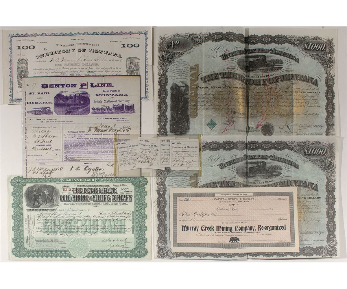 1-2) Two 1880 state bonds. Both have coupons 7 through 20! Signed by Territorial Governor Potts. Numbers 25 and 67. $1,000. 3) 1868 $100 bond to W. B. Morrison of the "Lewis & Clark Compnay." Number 361. Four unattached coupons included. 4) Benton Line to all points in Montana. Purple on white. Vignettes of steam train, paddle wheeler, and stage. To Mac Veagh & Co. For oysters from Chicago to Ft. Shaw. 5) Unissued Murray Creek Mining Company with small bear vignette. 189-. 6) Deer Creek Gold Mining and Milling Company stock certificate for 1000 shares in 1906. To Ernst Sandermann. Signed by John W Brock and Clyde Heller.