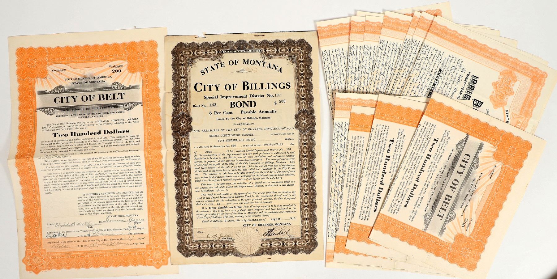 15 Montana Bonds: City of Billings Special Improvement Bond, 1927 (1) w/one loose coupon; City of Belt Special Sidewalk and Curb Fund Warrant, 1919 (4); Big Hole Irrigation District Bond, 1916 (10) w/coupons attached.