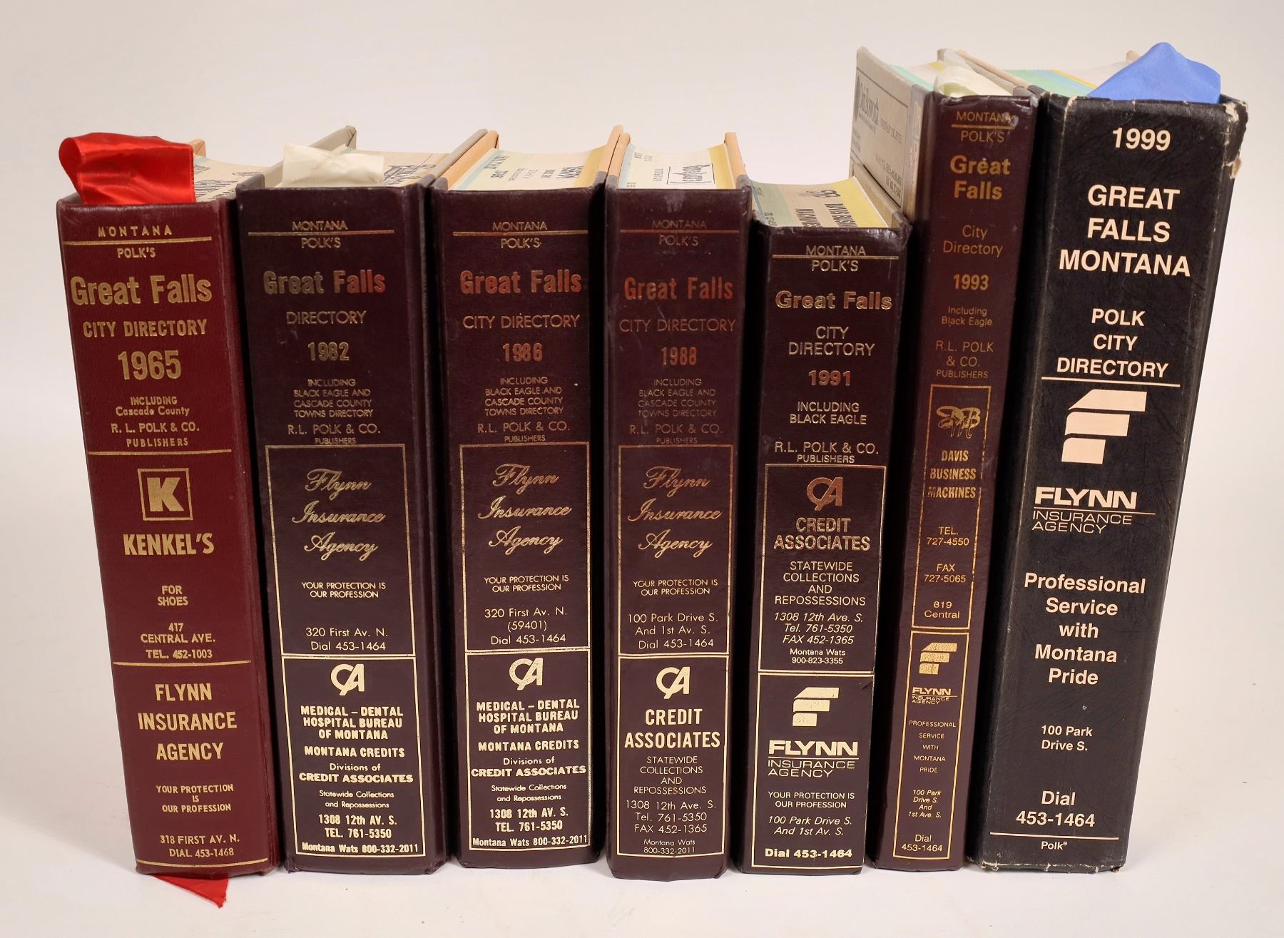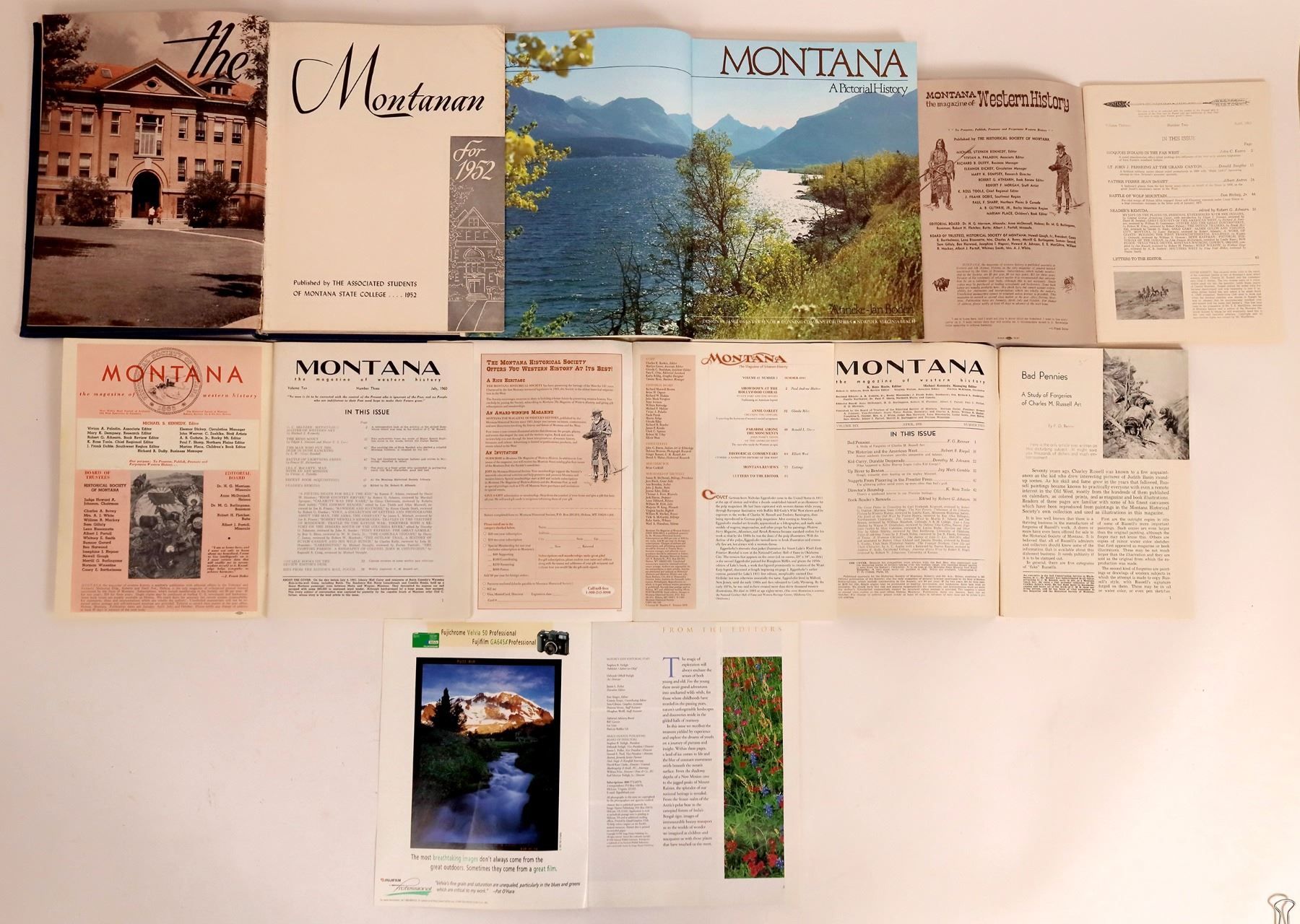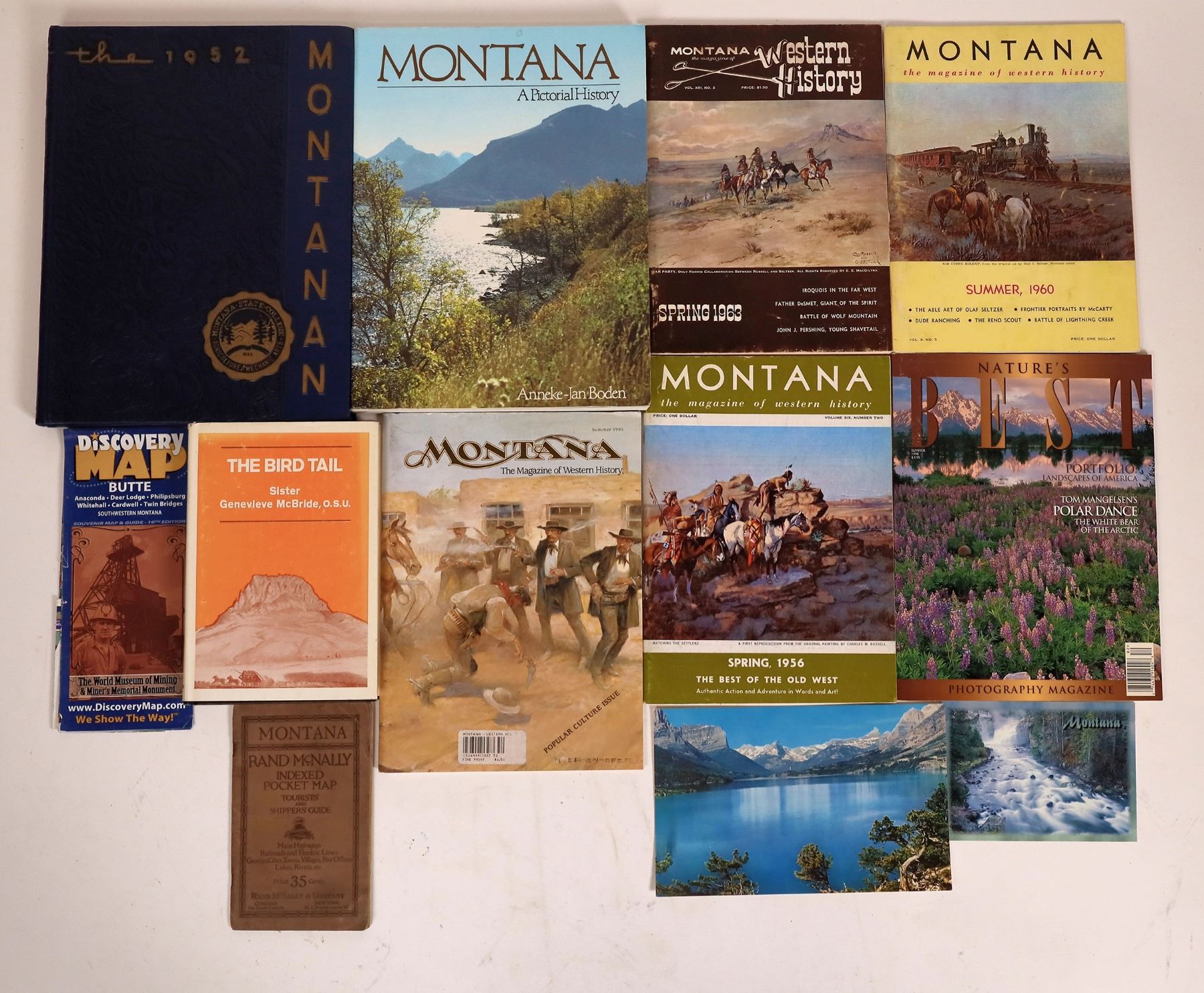 Nice assortment of Montana books and magazines. Montana Magazine 4 issues, 1956-95. The Bird Tail by McBride. Montana State College Yearbook 1952. Polk's Great Falls Directory 1965, 1982, 1986, 1988, 1983, 1999. Rand McNally indexed pocket map undated. Montana A Pictorial History by Boden.