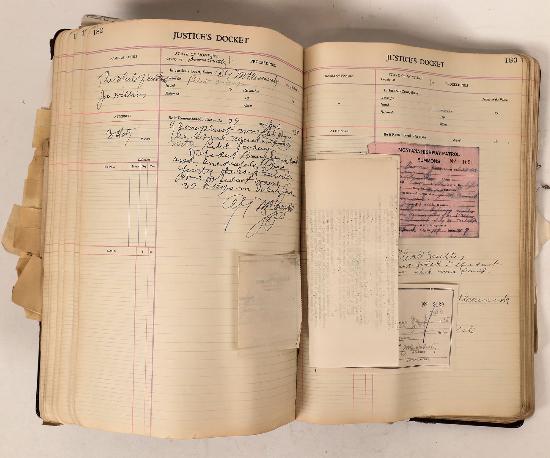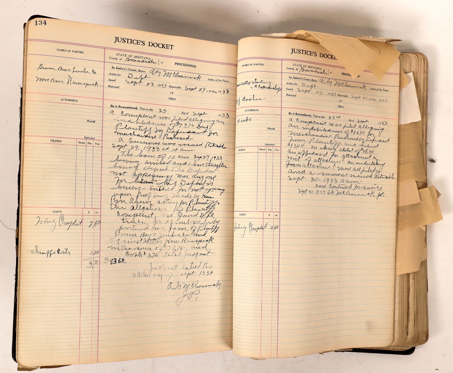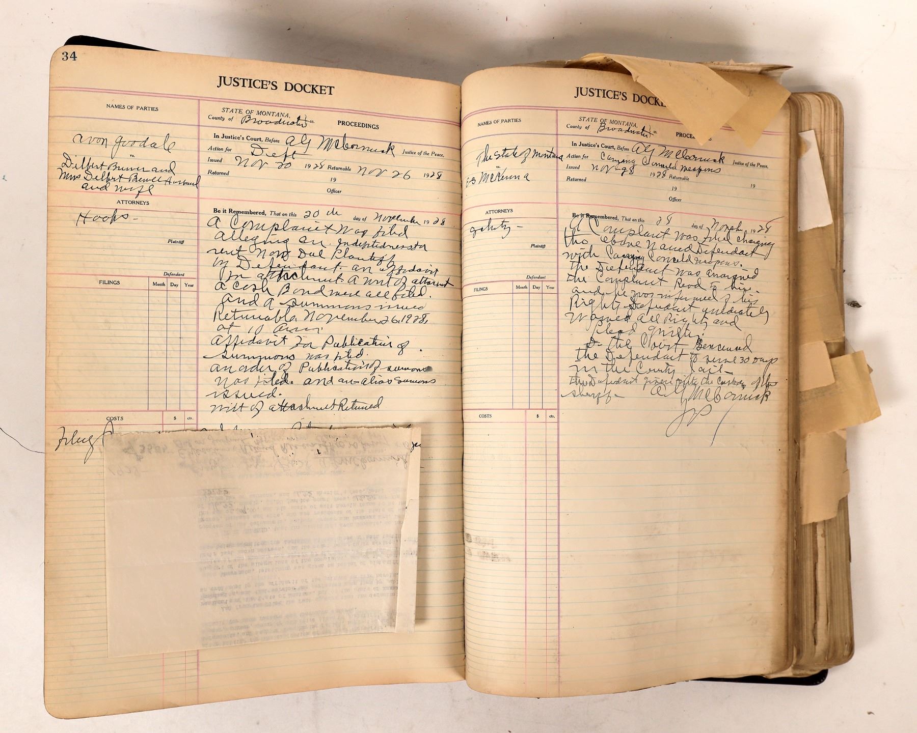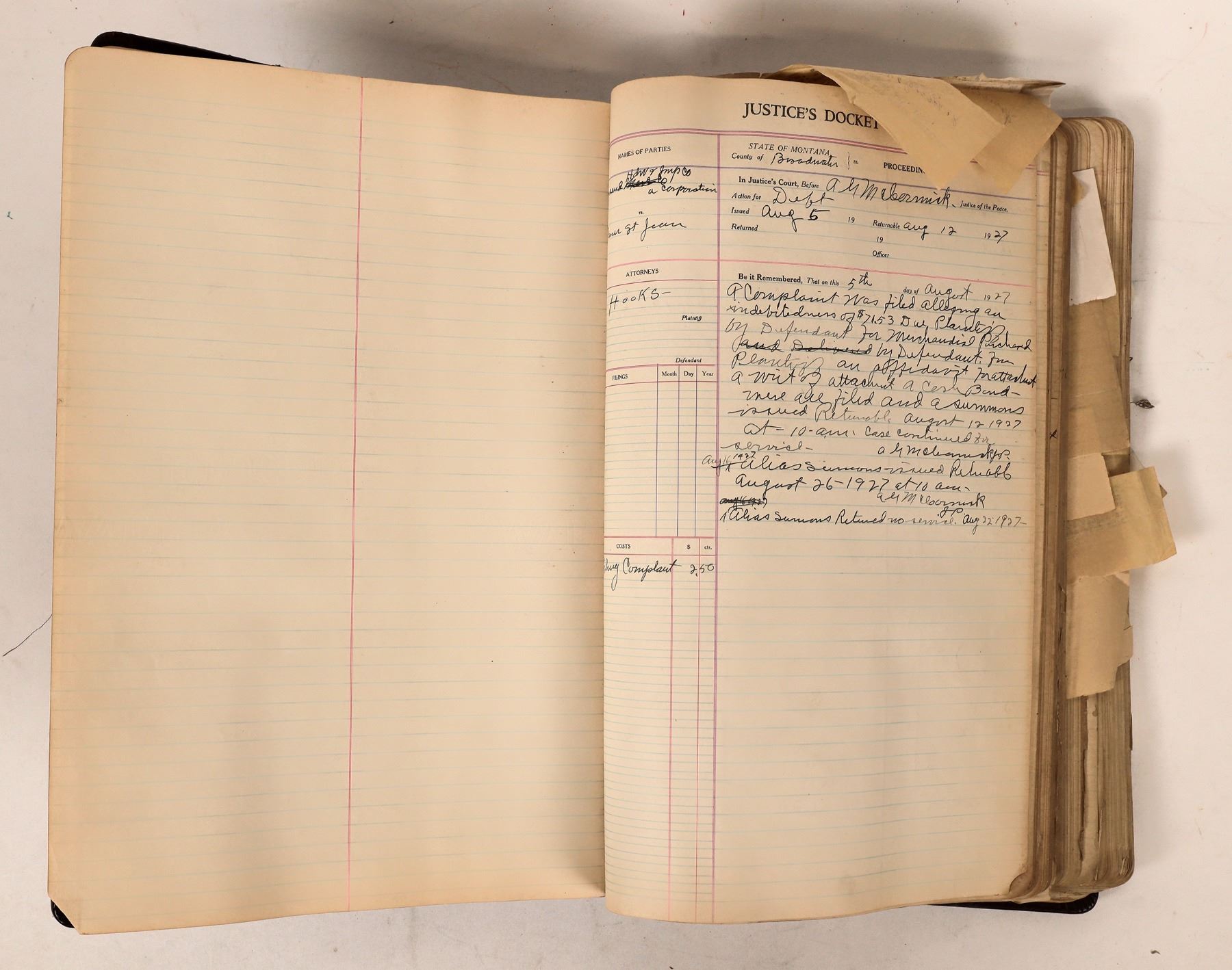1927 leather binder with justice dockets from Broadwater County, MT. Numerous complaints including debt, DUI etc with judgements. 16x10", spine detaching. Please inspect. Broadwater County Montana 1927