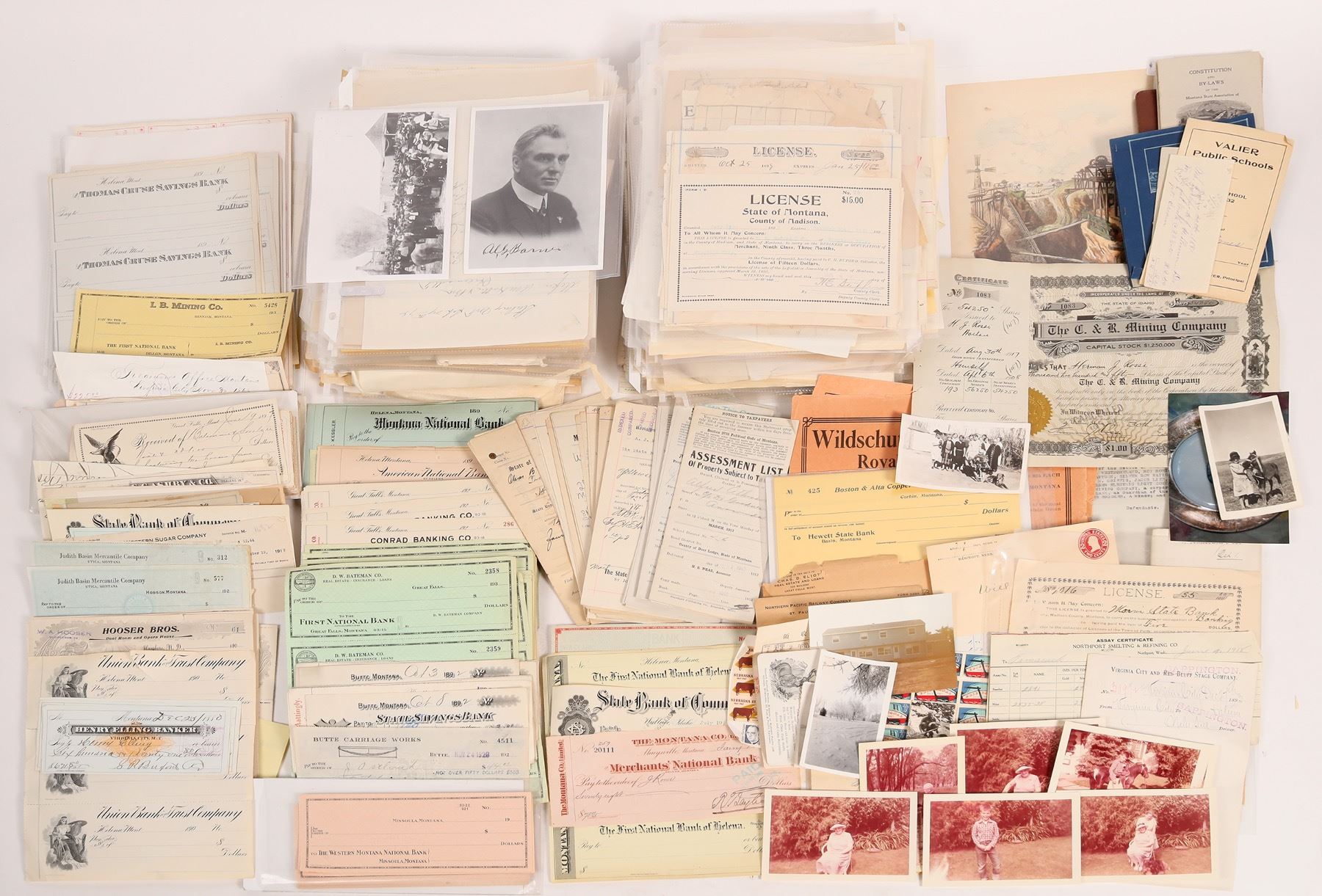 Mostly full file box of unsorted Montana ephemera. Some in page protectors, generally grade 1-2. Perhaps 500+ pieces. Letterheads, photos, brochures and more. About 19 lbs.