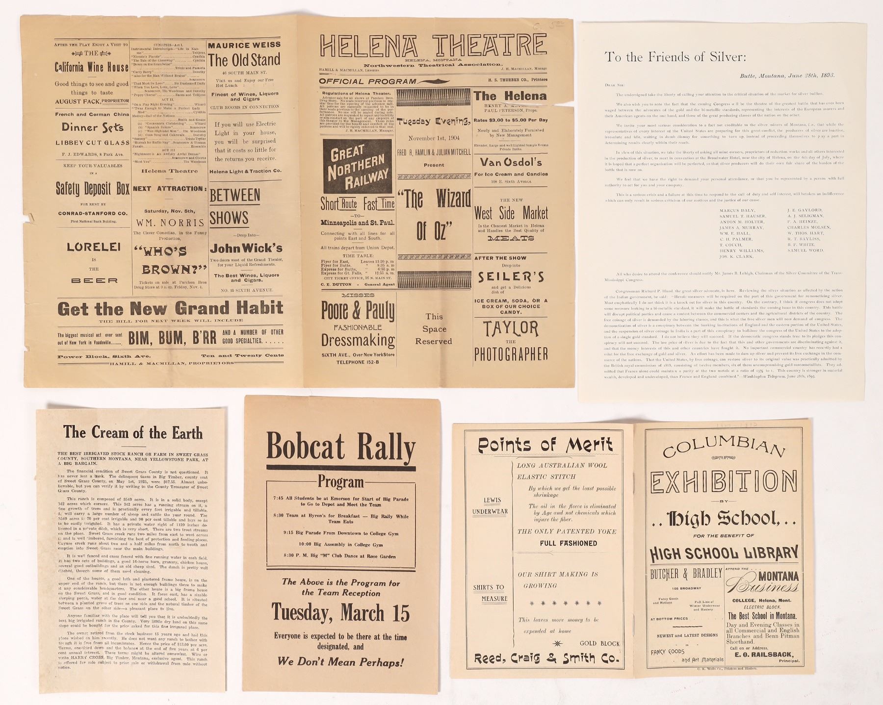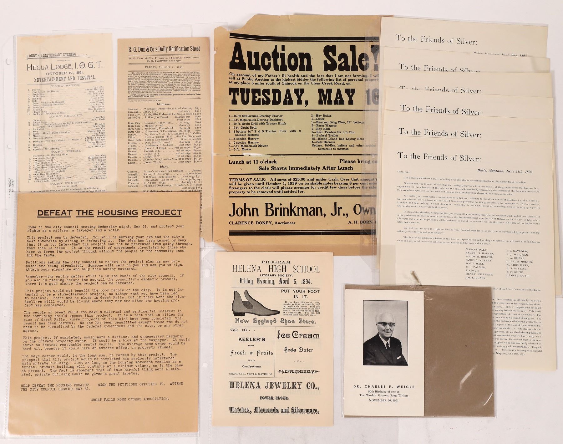Lot of seventeen. Includes a letter to the Friends of Silver. 1893. 2) Helena Theatre ads and promotions of movies (including the Wizard of Oz). 3) Daily Notification Sheet from RG Dun & Co. 1893. 4) 1894 Helena High School program. 5) Auction sale for farming equipment. 6) Helena Lodge Program. 1891 7) The best irrigated stock ranch in Sweet Grass County. 8) A plea to defeat the housing project from the Great Falls Home Owners Association. 9) High school Columbian Exhibition. Helena. Etc.