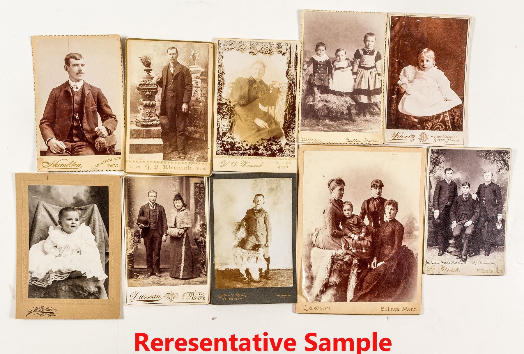 A spectacular cabinet card collection of different photographers from Montana, all from the classic period of about 1885-1900 from the Svoboda Collection. This collection contains more than 500 cabinet cards, all identified with the photographer's name or gallery. About a quarter or more are identified as to the person shown. At least 34 different towns are represented here. About half, 256 cards are from Butte or Helena. No other city other than Bozeman and Missoula have more than 20. The collection is a major accomplishment, even though it is markedly short on Virginia City photographers. The photographers here approximately quadruple the number of known photographers listed in Mautz, Biographies of Western Photographers. If you dont yet have this reference, go get one. It is a fabulous and extensive work of all the western states. Cities in this collection: Anaconda (19), Augusta (1), Anaconda & Granite (2), Big Timber (1), Belt (1), Boulder (4), Bozeman (35), Butte (126), Centerville (1), Darby (1), Deer Lodge (10), Demersville (1), Dillon (18), Ft Benton (2), Ft. Custer (1), Glendale (1), Great Falls (20), Kalispell (12), Billings (8), Thompson Falls (1), Virginia City (1), White Sulphur Springs (3), Walkerville (3), Stevensville (5), Superior (1), Red Lodge (1), Meaderville (3), Marysville (2), Missoula (50), Phillipsburg (9), Lewiston (1), Livingston (13), Helena (130), Hamilton (14). State: Montana City: HWAC#: 31700 Date: