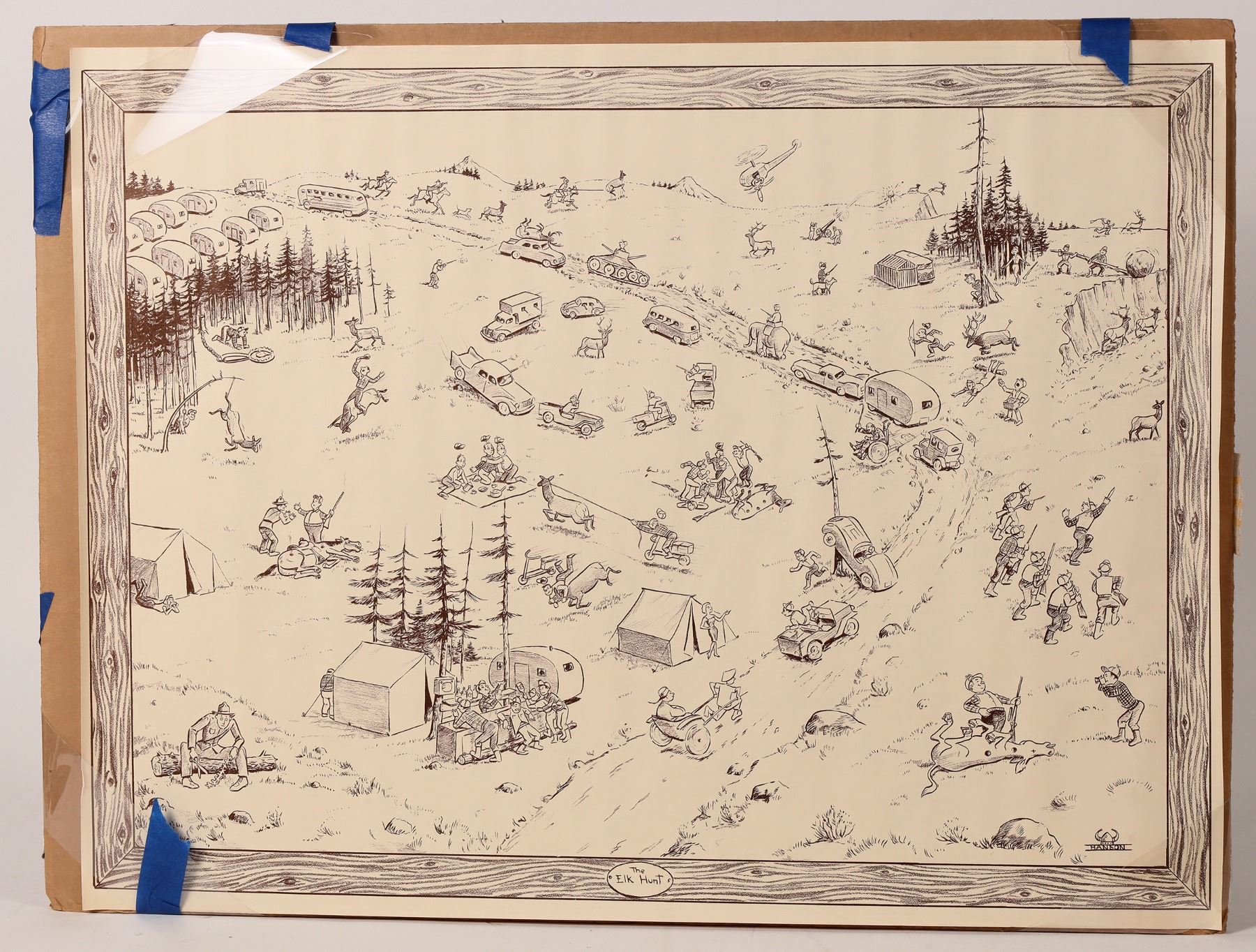 Drawn by an artist named Hanson, 23 x 17 inch print featuring a busy Montana countryside. The airstream trailers might indicate 1950s-1960s period. Montana