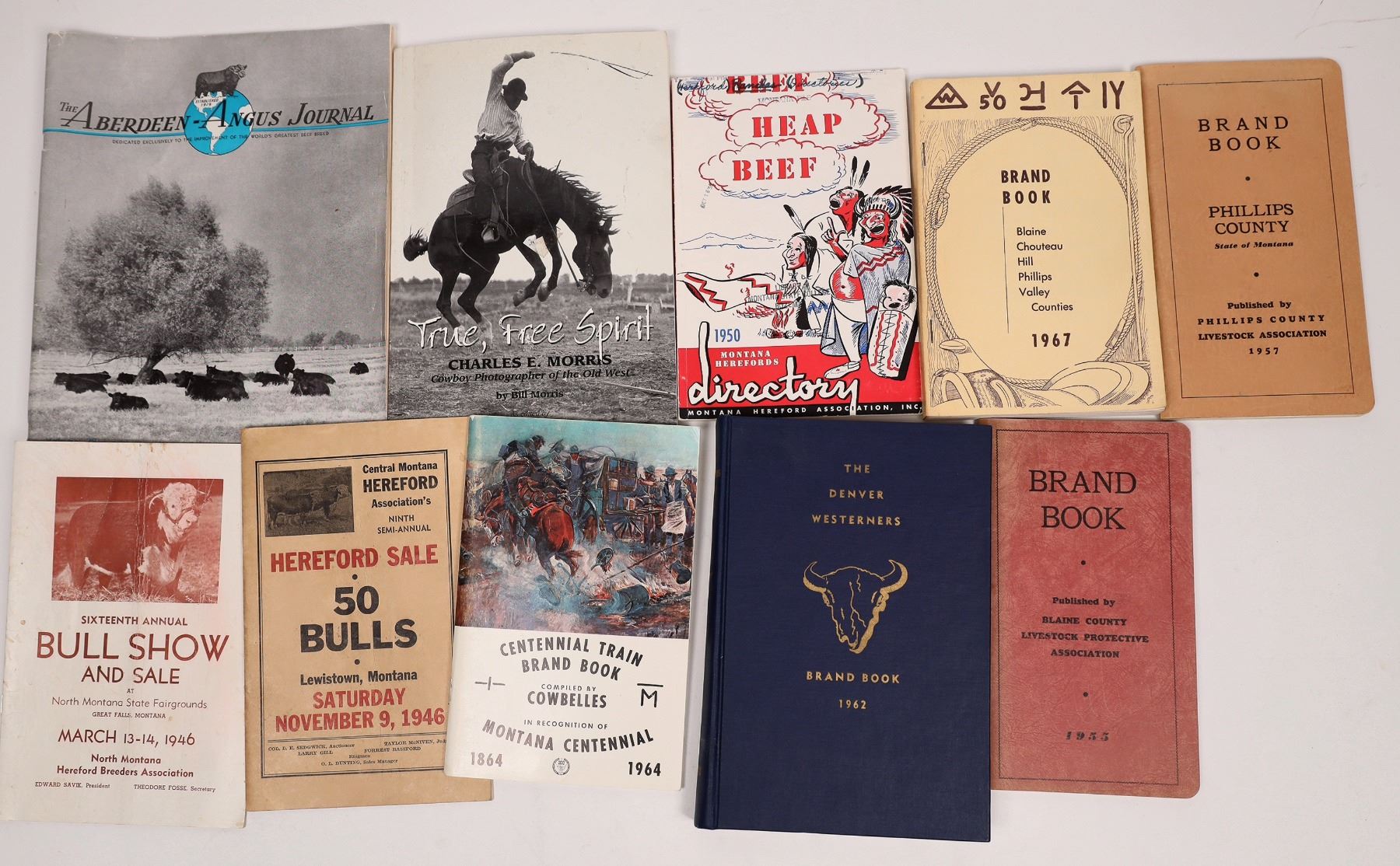 Brand Book By Blaine County 1955, Bull Show and Sale 1946-folded, Hereford Sales 1946, Beef Heap Beef 1950, Brand Book Phillips County 1957, Aberdeen-Angus Journal 1947. Centennial Train Brand Book 1964, True Free Spirit by Morris, Denver Westerners Brand Book 1962, Brand Book 5 Counties 1967.