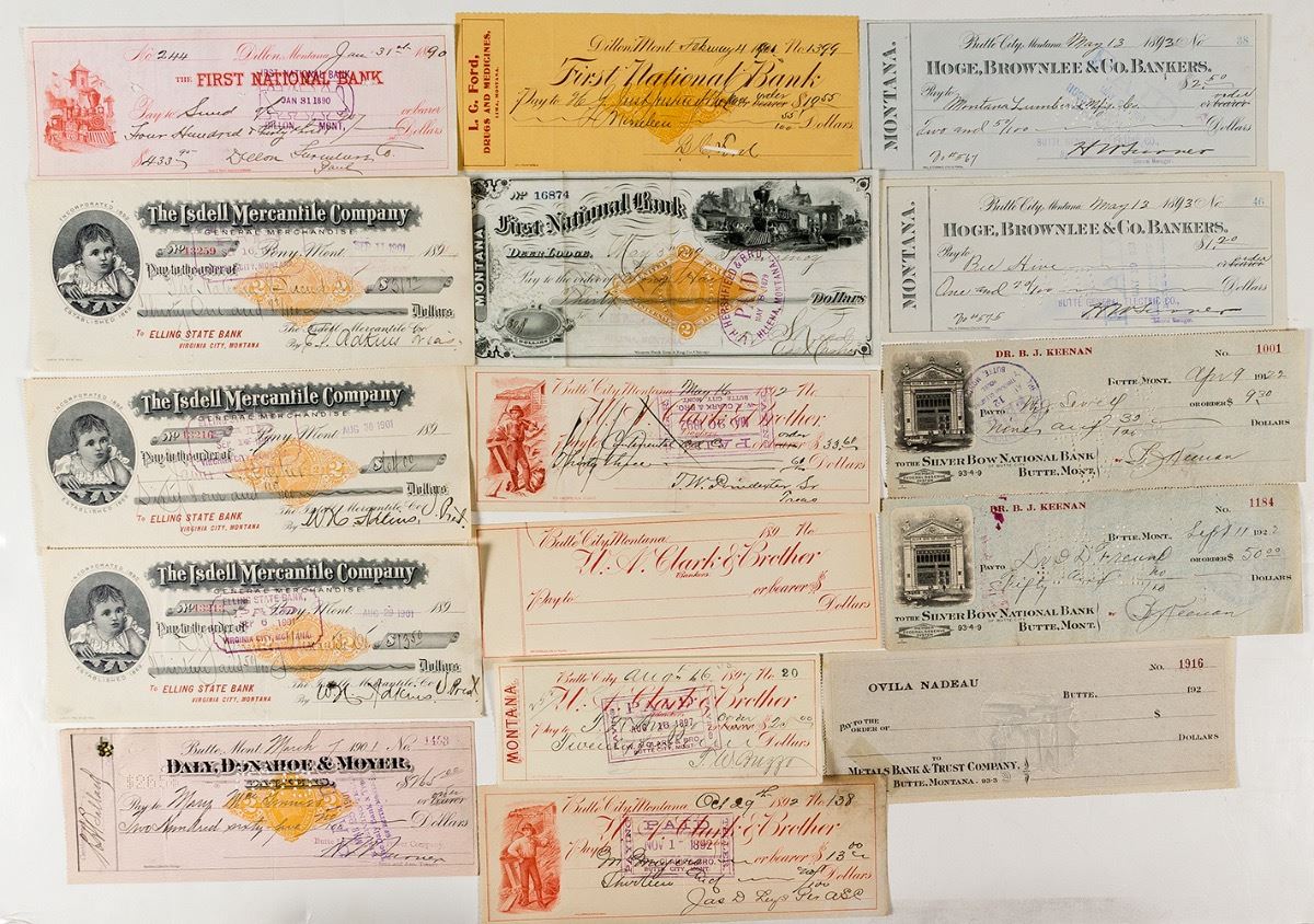 Lot of 16. Butte: W.A. Clark & Brother (four checks, 3 different, two pictorial (1892), one 1897, one unused), Hoge, Brownlee & Co. (two 1893), Daly, Donahoe & Moyer (1901, RN-X), Silver Bow National Bank (two 1922, pictorial), and unused for Ovila Nadeau (1920s). Pony: three Isdell Mercantile Company (pictorial, RN-X, 1901). Dillon: First National Bank (locomotive vignette, 1890), and L.C. Ford (Drugs & Medicines) (1901, RN-X). Also a gorgeous draft from the First National Bank, Deer Lodge, 1879, RN-G, locomotive vignette, to Chinese merchant (Tong Hai). City: State: Montana Date: 1879-1922 ID: 36241