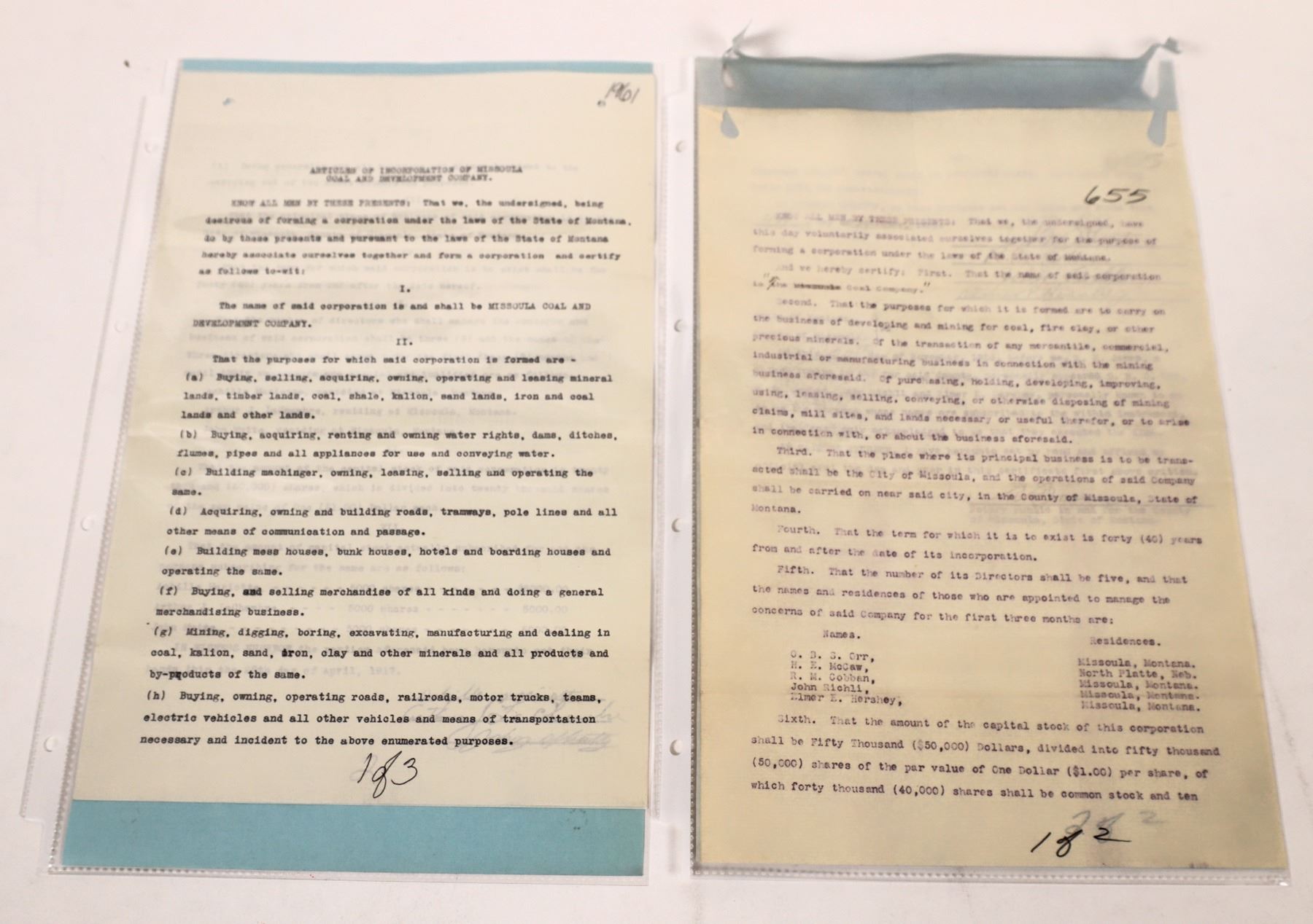 Article of Incorporation from 2 Montana coal companies. 1917 Missoula Coal and Development and 1903 The Coal Company. Montana