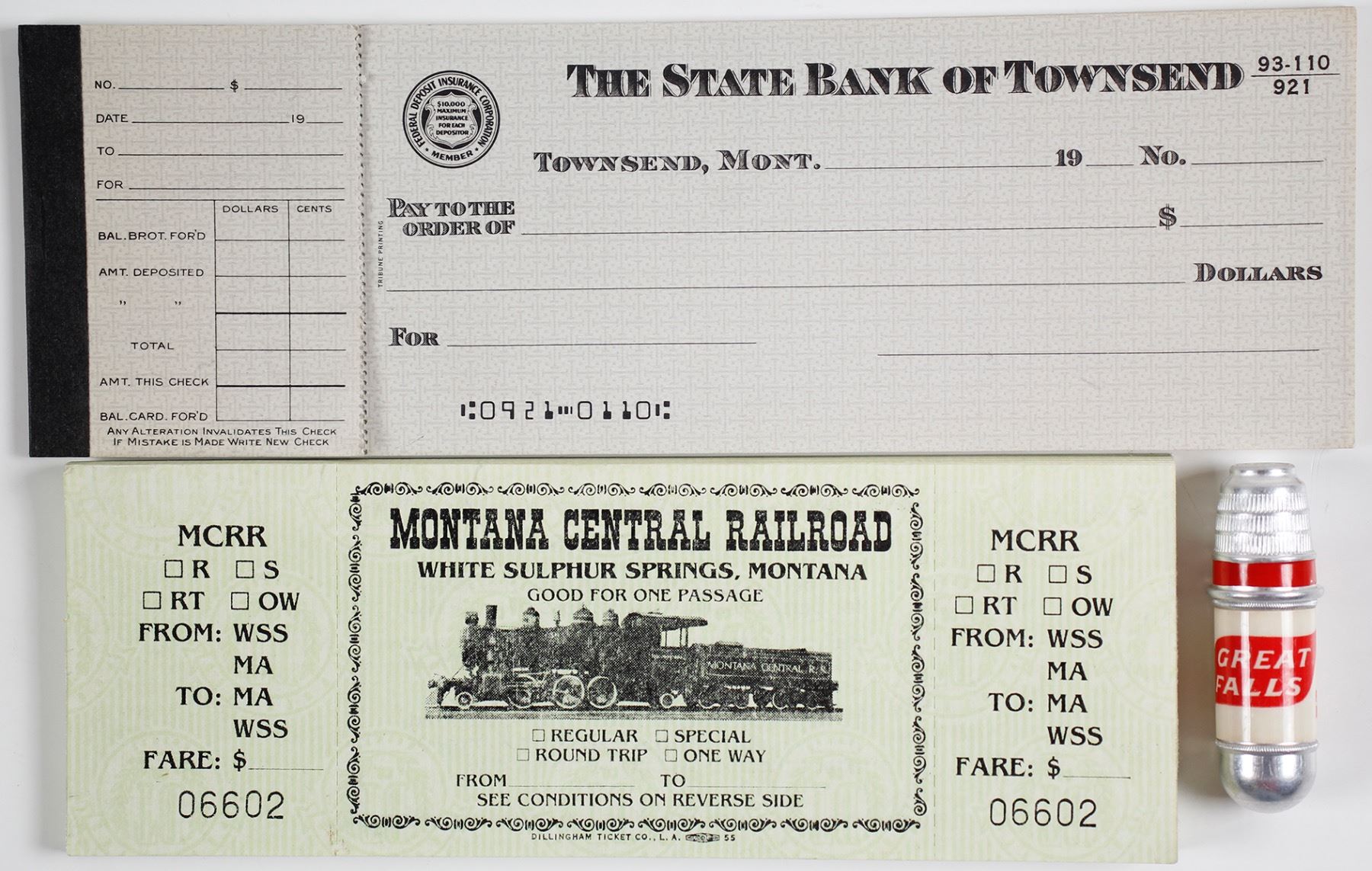 This collection includes a book of un-issued tickets for the Montana Central Railroad of White Sulphur Springs, Montana. Ticket numbers from 06602 to 06658. Also in the collection is a book of un-issued, unsigned, and unnumbered checks for The State Bank of Townsend, Montana, and a small emergency sewing kit with needles and thread wound on a wooden spool, all contained in an aluminum capsule with one end that unscrews to become a thimble. Date: Location: Montana HWAC# 64219