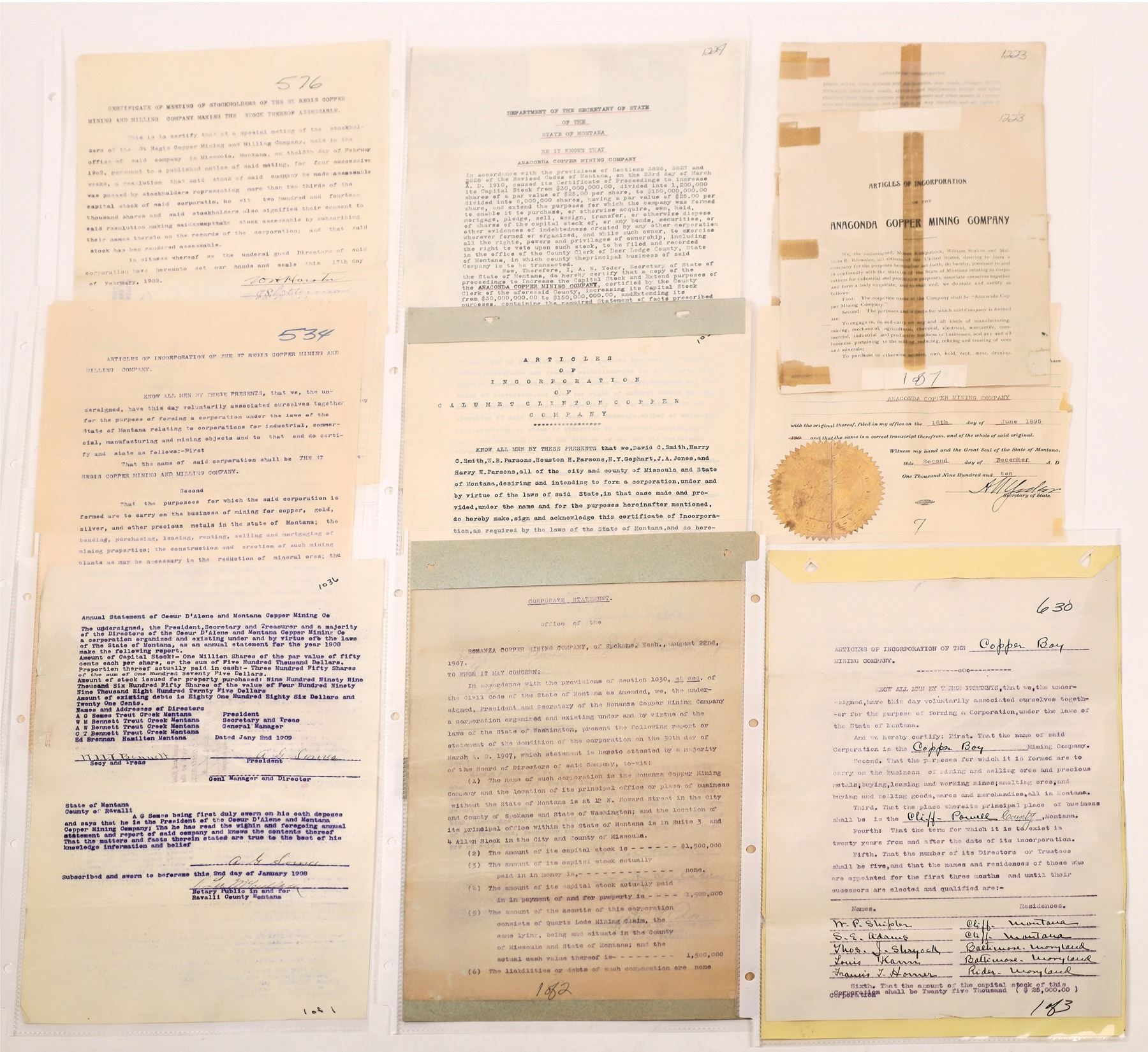 8 Montana copper mine articles of incorporation and other corporate documents. Copper Bay, Anaconda-tape repairs, Regis, Bonanza, Coeur D'Alene, Calumet Clinton. Montana Montana