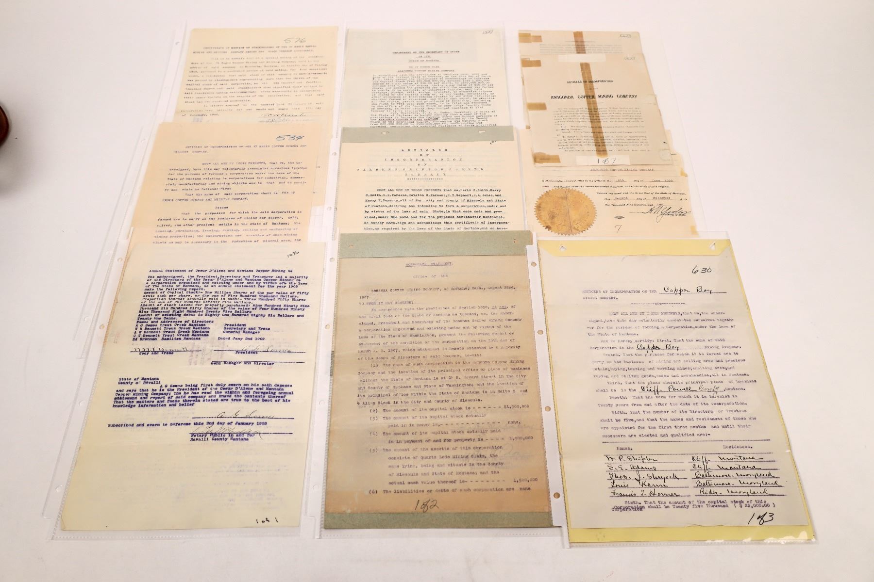 8 Montana copper mine articles of incorporation and other corporate documents. Copper Bay, Anaconda-tape repairs, Regis, Bonanza, Coeur D'Alene, Calumet Clinton.