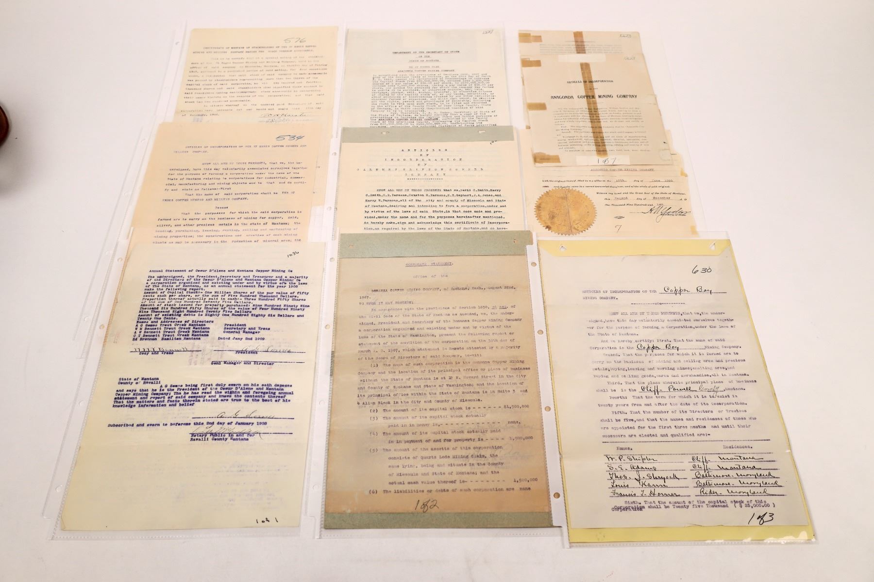 8 Montana copper mine articles of incorporation and other corporate documents. Copper Bay, Anaconda-tape repairs, Regis, Bonanza, Coeur D'Alene, Calumet Clinton. Montana