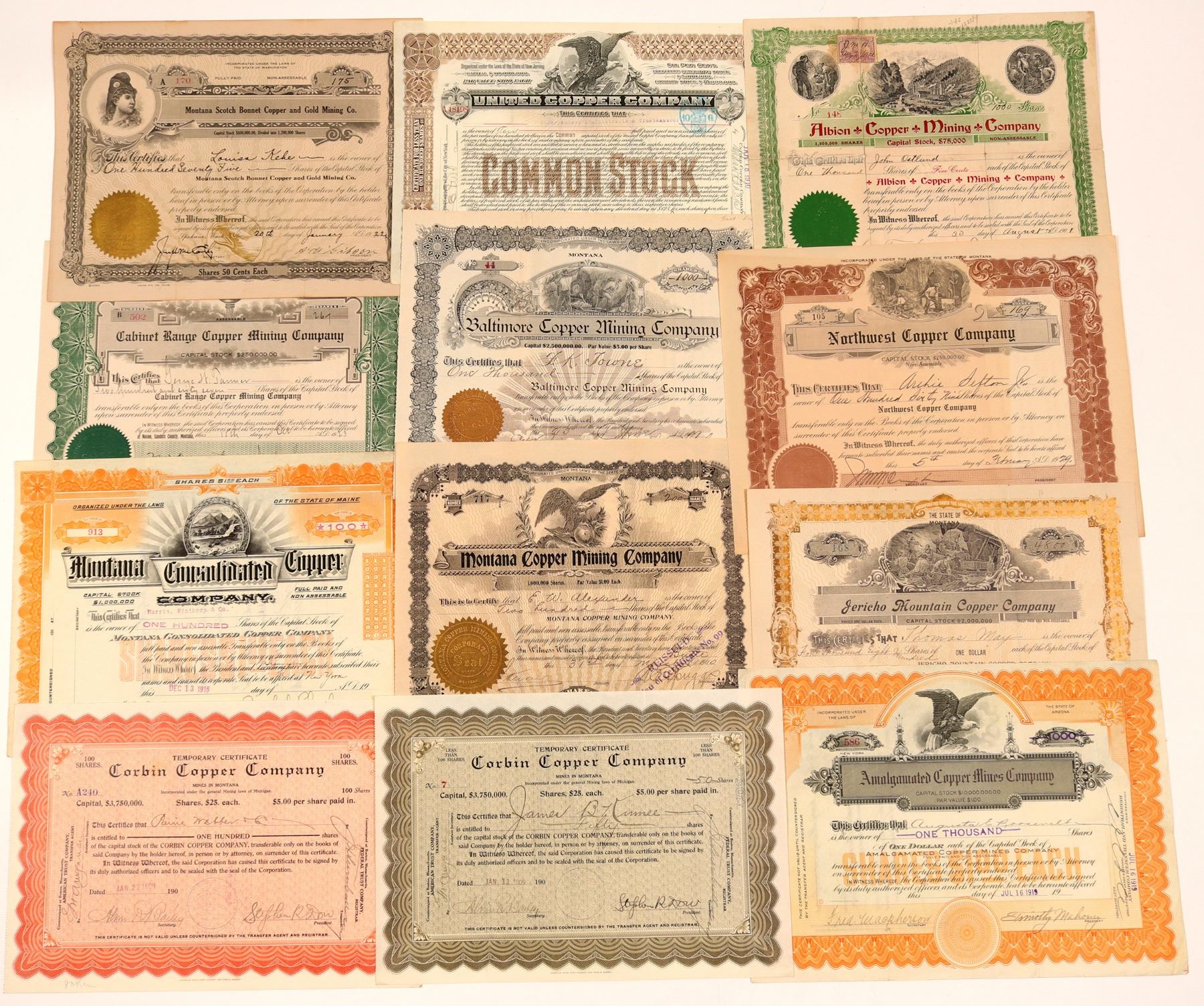 Lot of 12 different. Included: Albion Copper MC (Granite County, 1901, mining vignettes); Corbin Copper Co. (two different 1909); Amalgamated Copper MC (1919, eagle vignette); Jericho Mountain Copper Co. (1907, mining vignette); Northwest Copper Co. (1929, mining vignette); United Copper Co. (1910, mining and eagle vignette); Baltimore Copper MC (1909, mining vignette); Montana Copper MC (1900, eagle vignette); Montana Cons. Copper Co. (1915, Nature vignette); Cabinet Range CMC (1923); and Montana Scotch Bonnet Copper & GMC (1922, vignette of woman). Fair to good condition. Please inspect. Ken Prag Collection