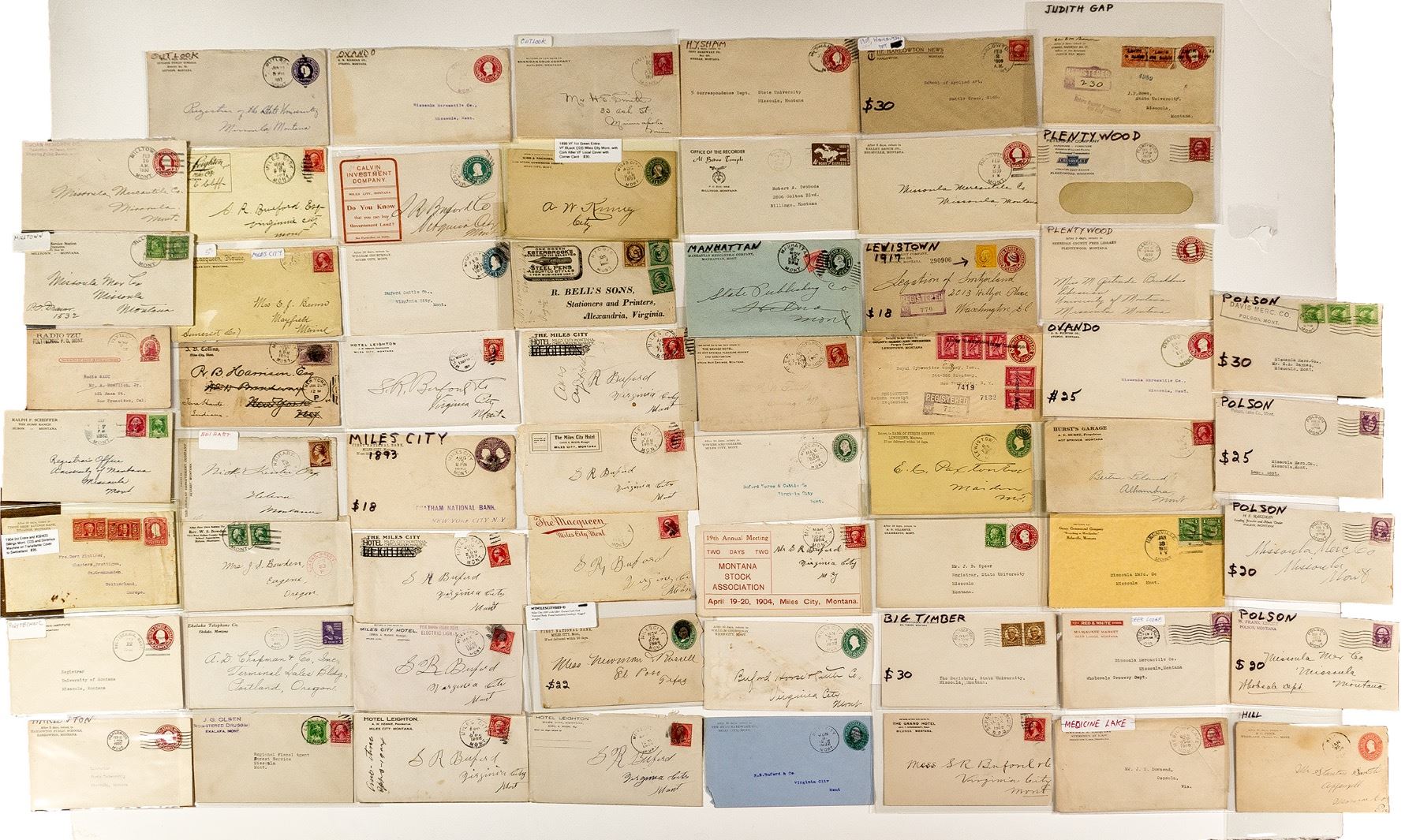 About 50 total pieces of corner covers from various companies and towns in Montana. CC's include J.G. Olsen Druggist, Ekalaka Telephone, The Macqueen House, Hotel Leighton, The Miles City Hotel, Calvin Investment Co., The Savage Hotel, and many more. Postmarks include Ekalaka, Sykes, Neihart, Miles City, Harris, Hunters Hot Springs, and others. State: Montana City: HWAC#: 38734 Date: