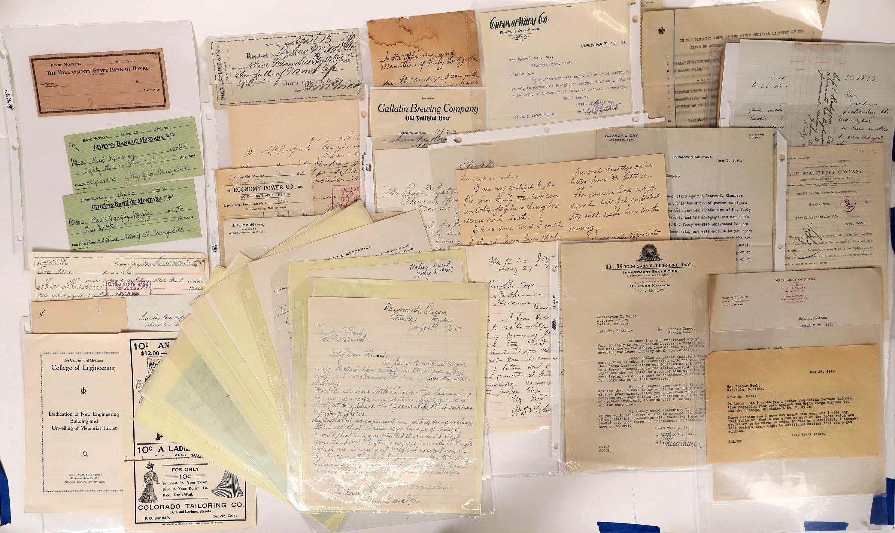 Mostly 19th century Montana correspondences and business related ephemera. Checks, legal documents, billheads etc. Dozens of items. About 3.8 lbs. Montana Stuart Mackenzie Montana Ephemera Collection