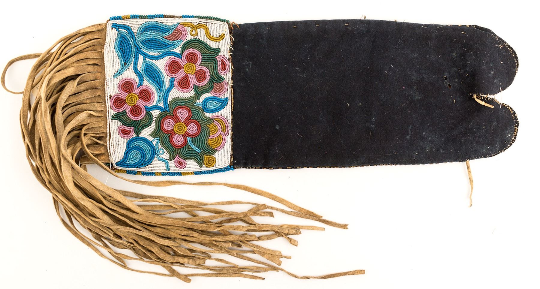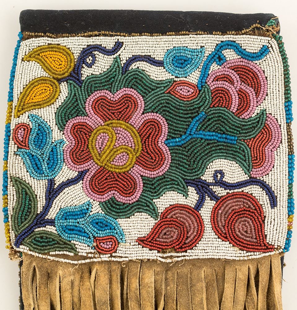 c. 1880's black cloth and beaded tobacco bag. 2 different bead designs, front and rear. Long fringes. 6.5" x 18.5 inches. Multiple moth holes in the fabric Consigned by The Cowboy Connection in Livingston, MT. State: City: Date: ID# 49809