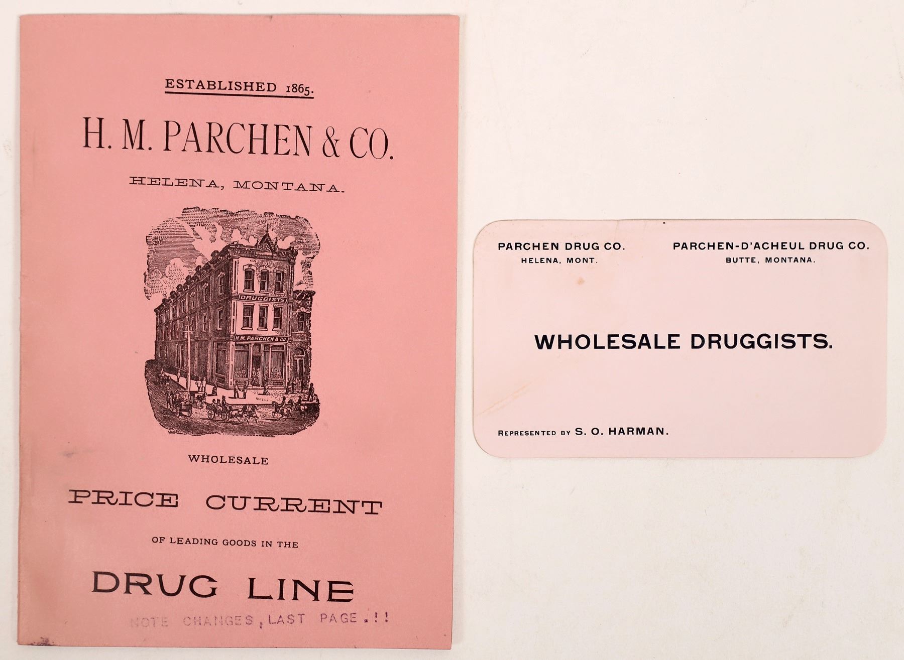 Business card and published catalog from HM Parchen in Helena. c. 1890's. Catalog 6.75x5.5", card 2.5x4.5".