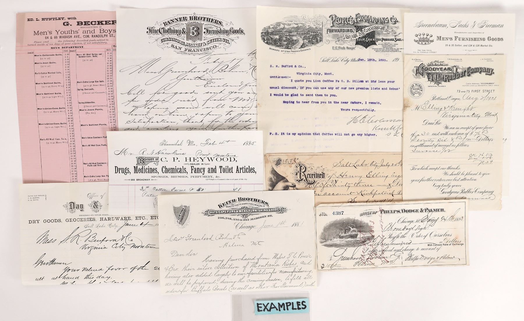 Group of about 40 mostly letterheads and billheads for dry goods going into and out of Montana, c. 1879-96. Clothing, lace novelties, guns, drugs, furs, gloves, boots etc. Montana c. 1879-1896