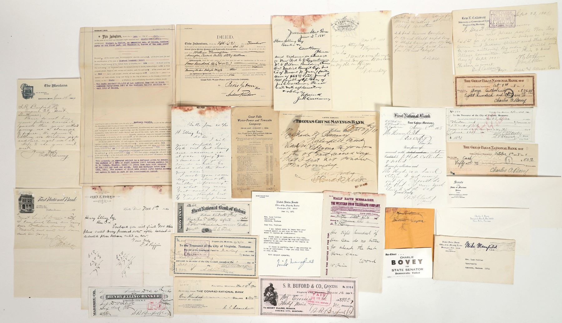 Lot of 20. All in protective sleeves. Checks, letters , indentures, notes. Each has articles regarding the individual. Includes: Daniel Webster Tilton (check) Created :The Montana Post"1866 also Tilton and Barber groceries closed 1883. William Ennis brought merchandise to Alder Gulch 1863 set other enterprises to support the gold camp. Russell B. Harrison Moved to Helena 1878 working in U.S. Assay Office, became Senator , lawyer, diplomat and the son President Benjamin Harrison and the grandson of President William Harrison. Other notables: B.F White, Frank Cooney, C. E. Conrad, Paris Gibson, Richard Harlow, Noah Armstrong, Robert S. Ford, James E. Callaway, Thomas Cruse, Lew Callaway, F.A. Riggin, Samual Word, Mike Mansfield, L. B Olds and Charles A Bovey .