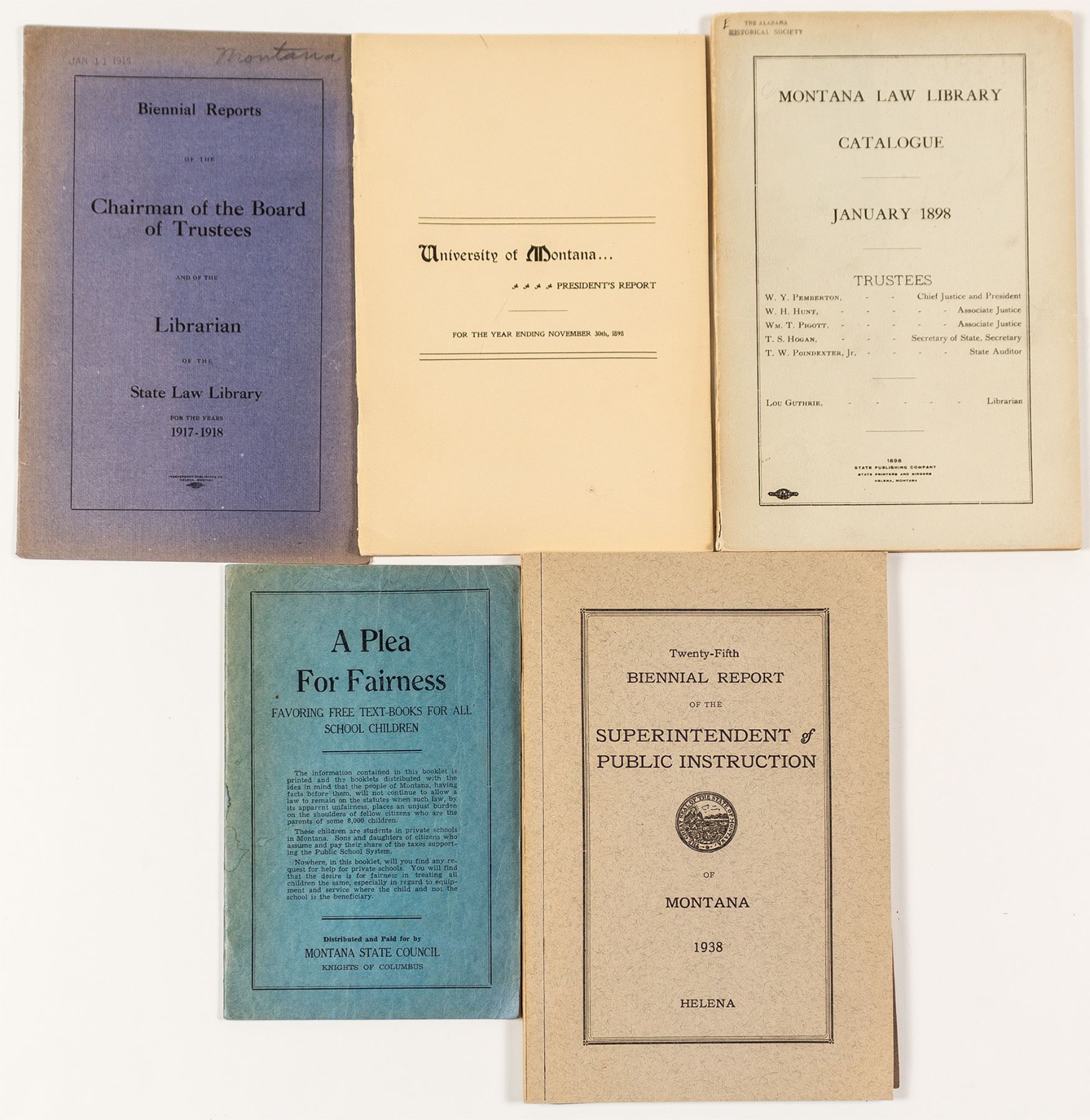 Included: Biennial Reports, Chairman of the Board of Trustees and the Librarian of the State Law Library, 1917-1918; University of Montana President's Report, 1898; Biennial report of the Superintendent of Public Instruction of Montana, 1938, Helena; Montana Law Library Catalogue, 1898; A Plea for Fairness, Favoring Free Textbooks for all School Children. State: Montana City: HWAC#: 40622 Date: