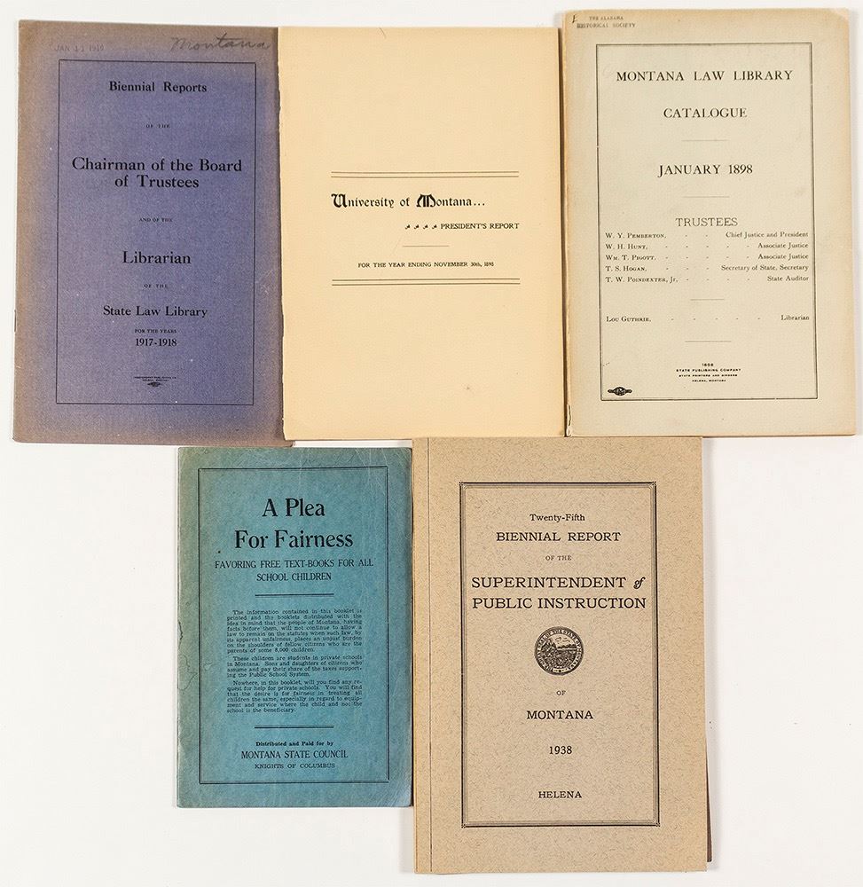 Included: Biennial Reports, Chairman of the Board of Trustees and the Librarian of the State Law Library, 1917-1918; University of Montana President's Report, 1898; Biennial report of the Superintendent of Public Instruction of Montana, 1938, Helena; Montana Law Library Catalogue, 1898; A Plea for Fairness, Favoring Free Textbooks for all School Children. HWAC# 40622 Date: Location: Montana