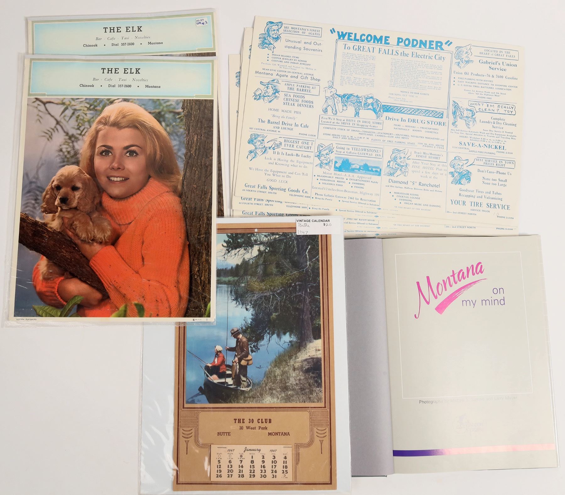 Lot of miscellaneous Montana-related ephemera. Includes advertising prints from Butte and Chinook, advertising ink blotters from Great Falls (4 duplicates), a Water Awareness Month poster from the Montana Watercourse, and a photography book called Montana on My Mind. Various sizes, largest is 17.5 x 22.5 inches. Montana Montana