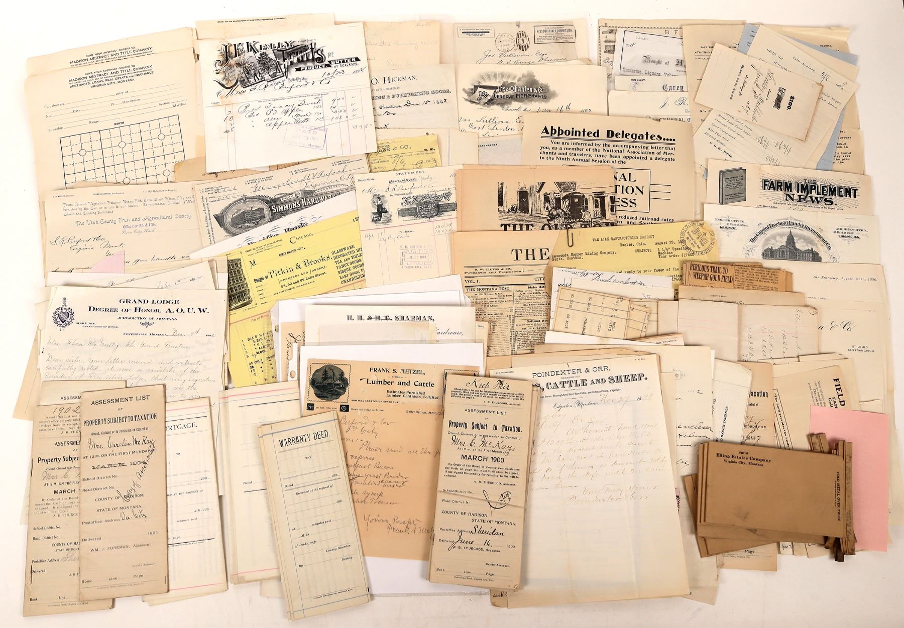 About 60 pieces of assorted Montana Ephemera c. 1875-1906. Unused Elling Estate envelopes, letters, billheads-some pictorial, banking, food price list, real estate assessments, receipts, etc. Montana c. 18751906