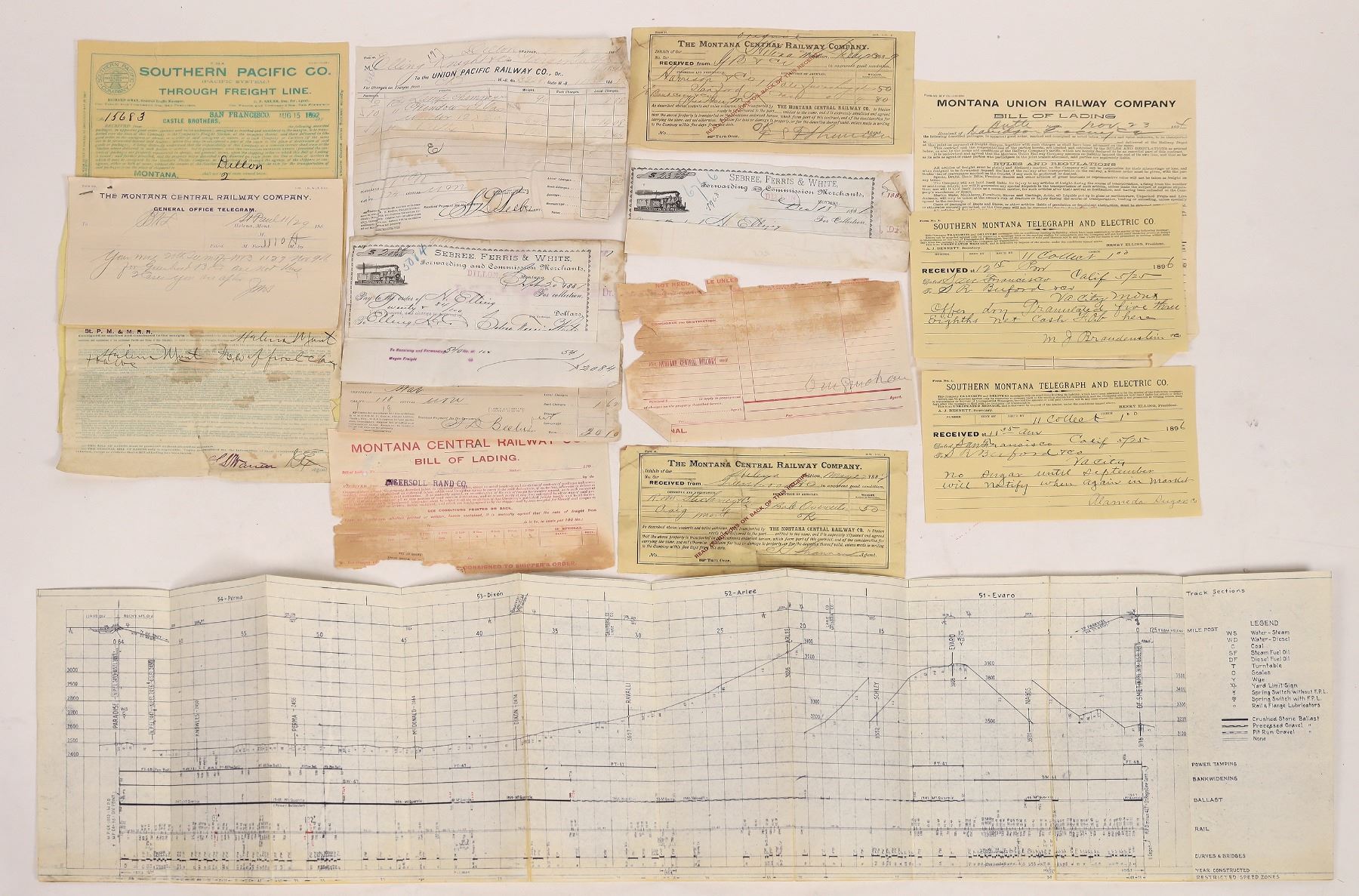 About 15 pieces of Montana ephemera including mine map with Potosi Mine etc. 44x41".N P Railroad track map 1960, telegraphs, bill of lading, railroad etc. Mostly c. 1880's to 90's.