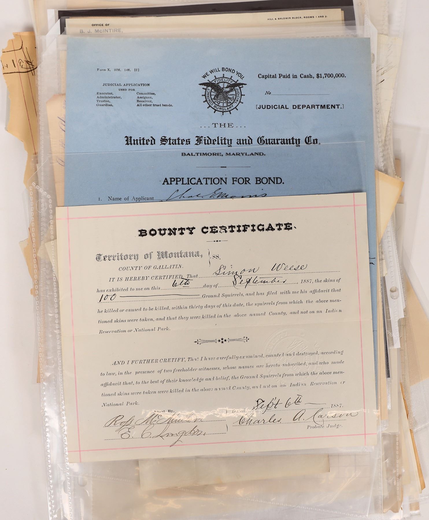 Montana ephemera from receipts to correspondence and everything in between. Everything from a grazing Permit, a bond for The Bank of Billings, a 1911 electric bill, a 1926 architect report and many more. All are in good condition. Please see photos for more details. Montana Stuart Mackenzie Montana Ephemera Collection