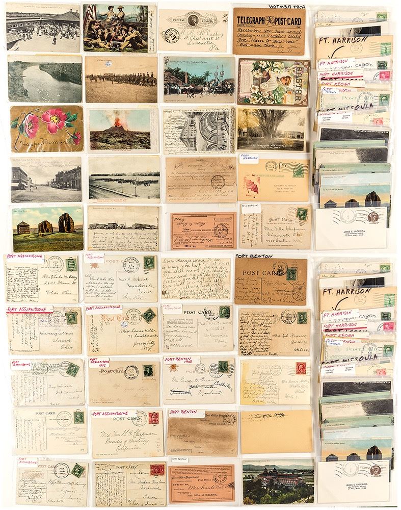 Approx. 60 postcards from 8 different forts, including some historic pieces. 2 Fort Missoula; 2 Fort Keogh--1 RPC of horses crossing a river; 4 Fort Logan (one card is leather); 5 Fort Harrison; 11 Fort Peck, includes 7 historic unused RPC's of the Fort Peck dam; 11 Fort Assiniboine; 4 Fort Shaw; 16 Fort Benton, includes 5 RPC's--1 of the swimming pool at Fort Benton. Included are 10 postal cards and 1 card from forsyth, Mont. (Svoboda Collection) City: State: Montana Date: c-1891-1950 HWAC# 35547